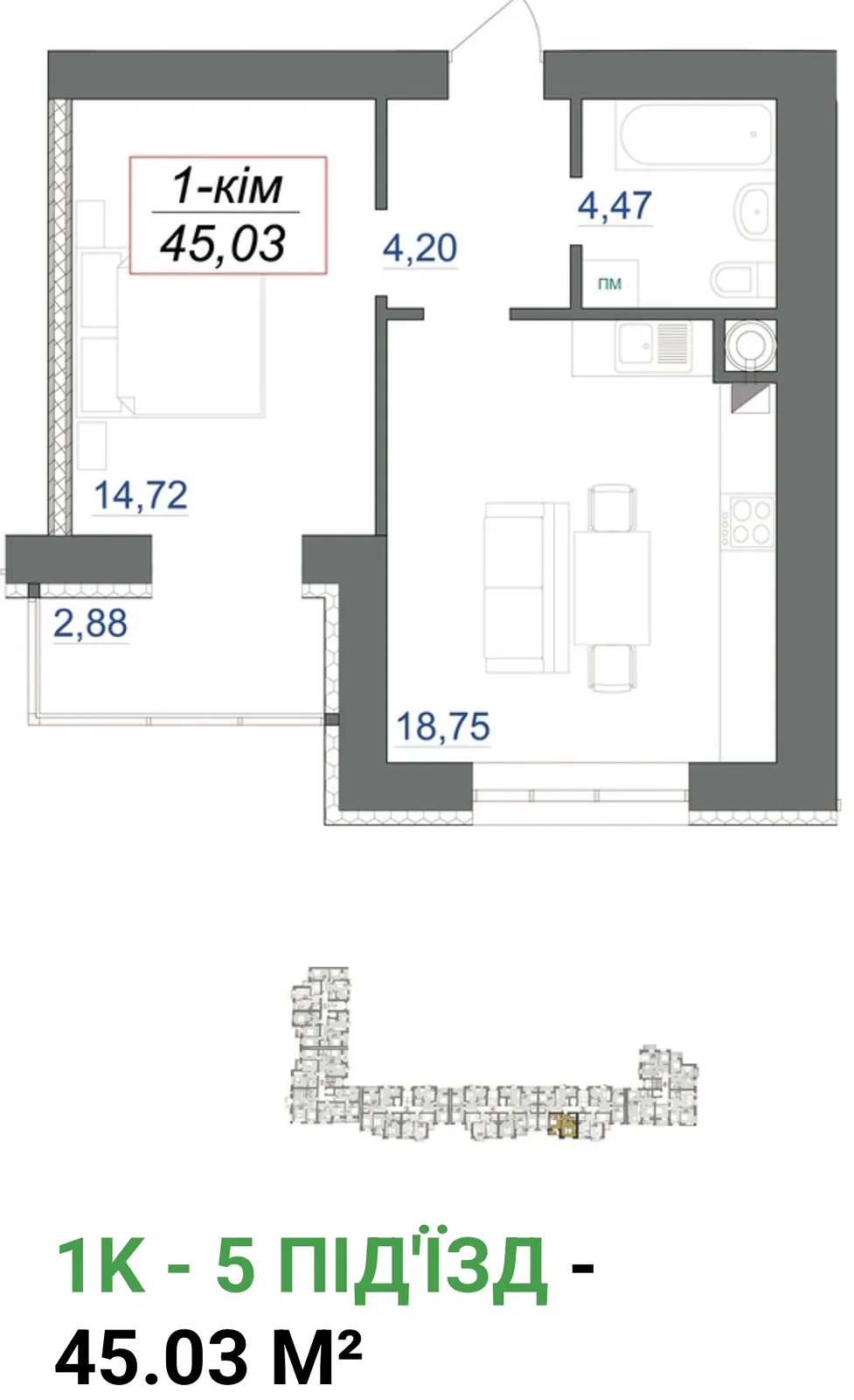1-кімнатна квартира 44 м у хорошій локації поруч центру!