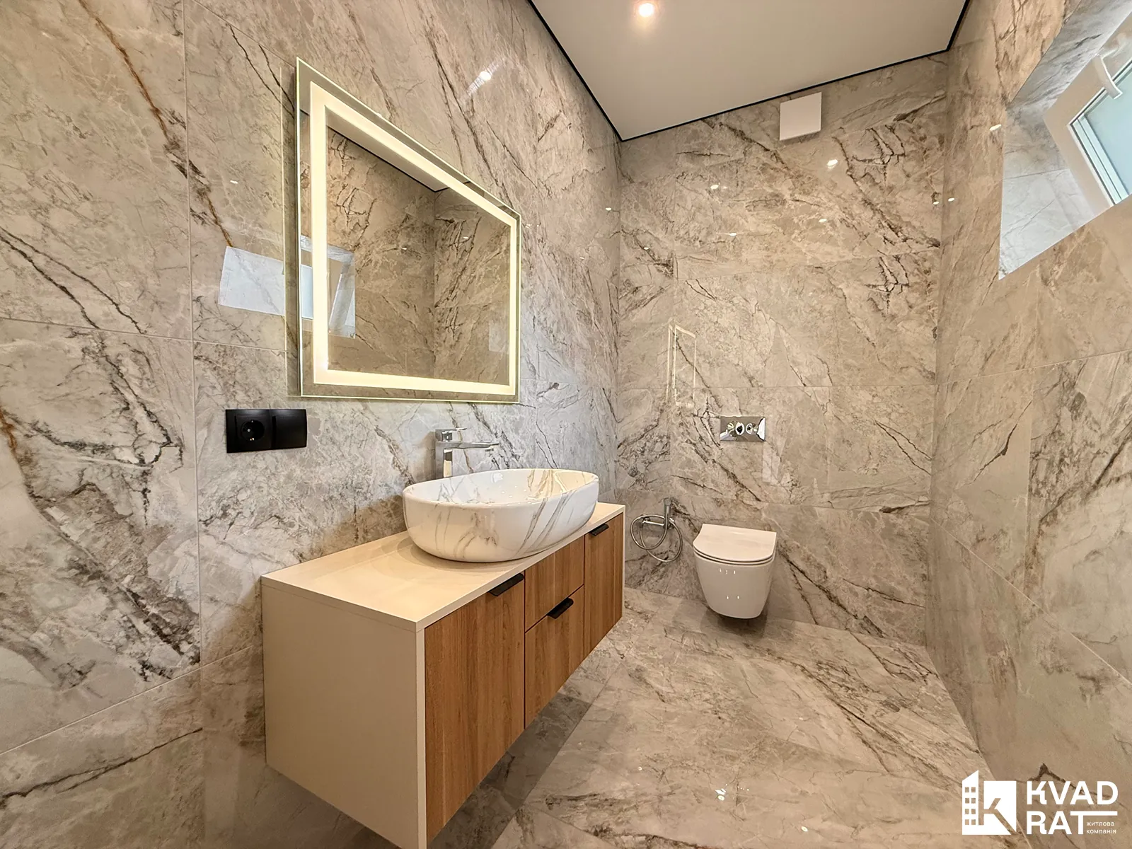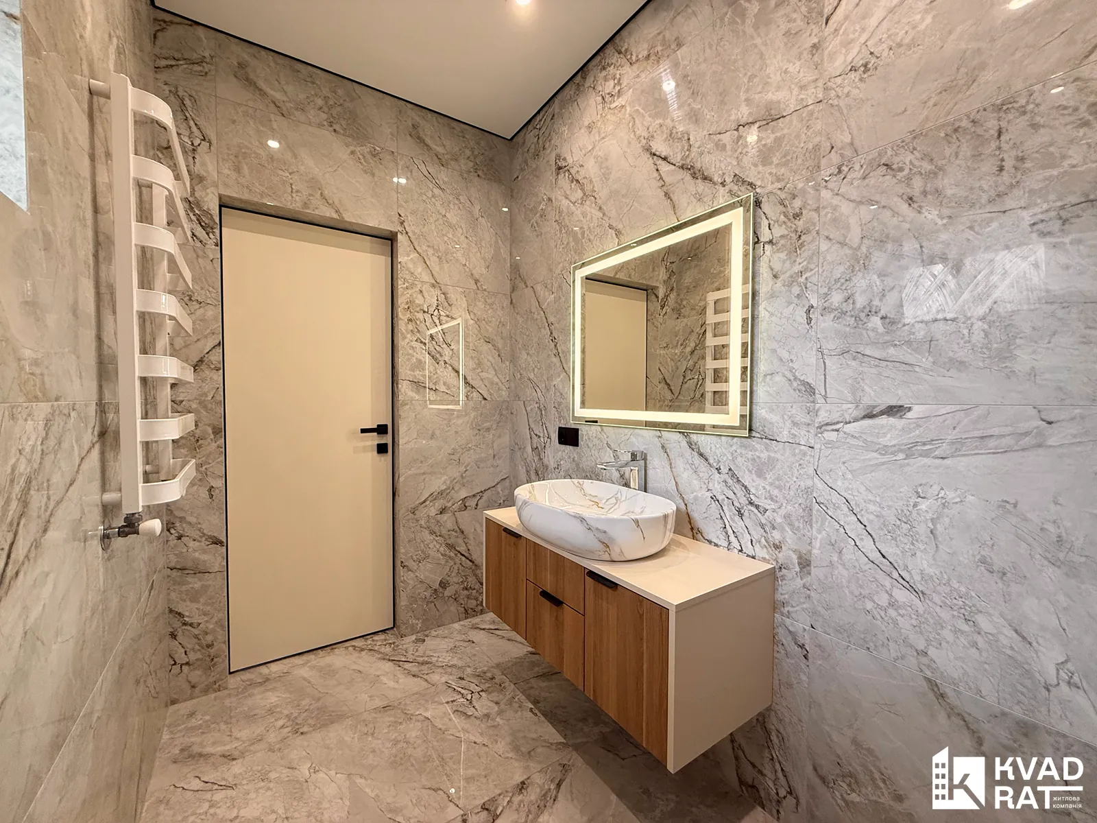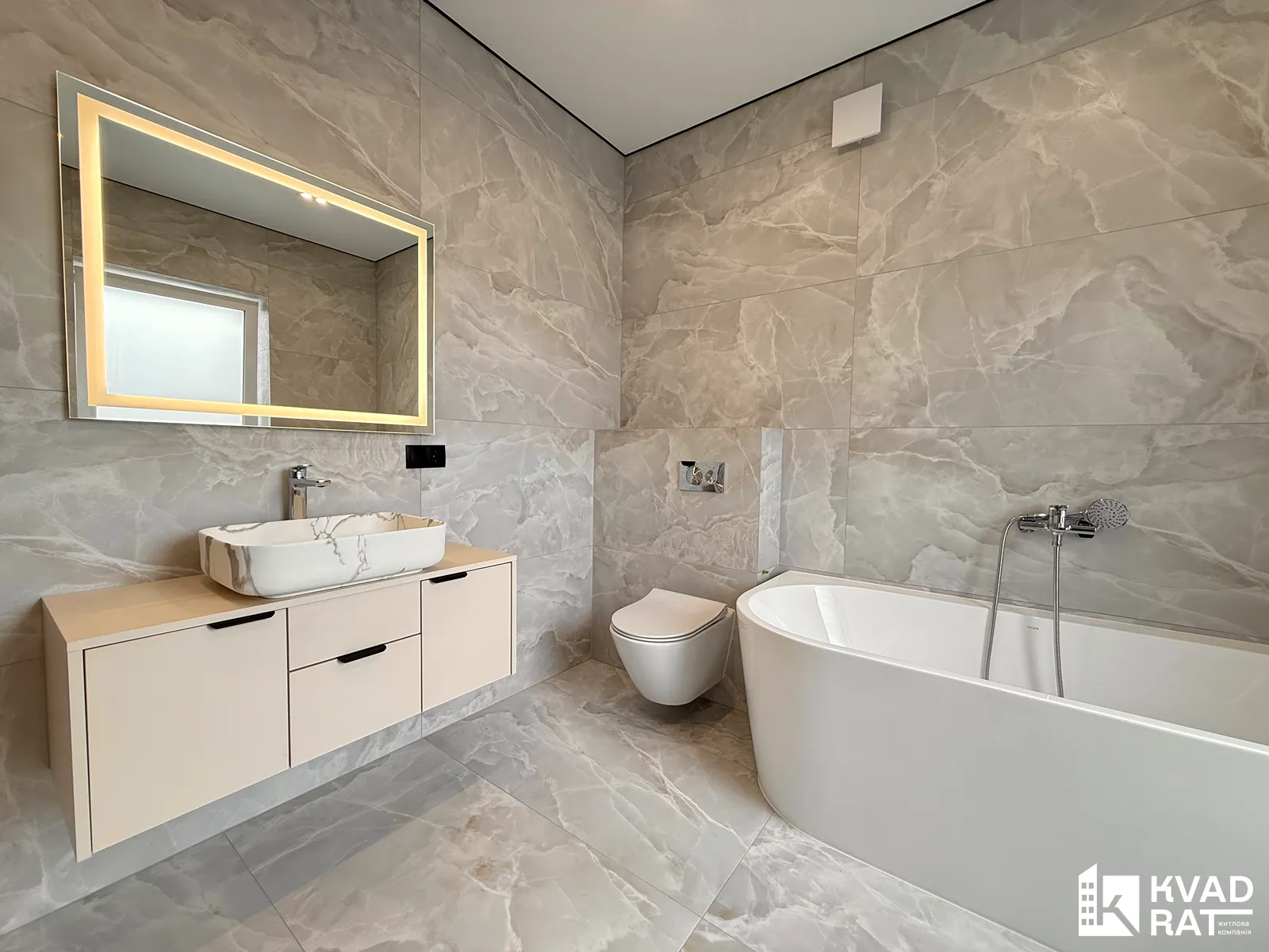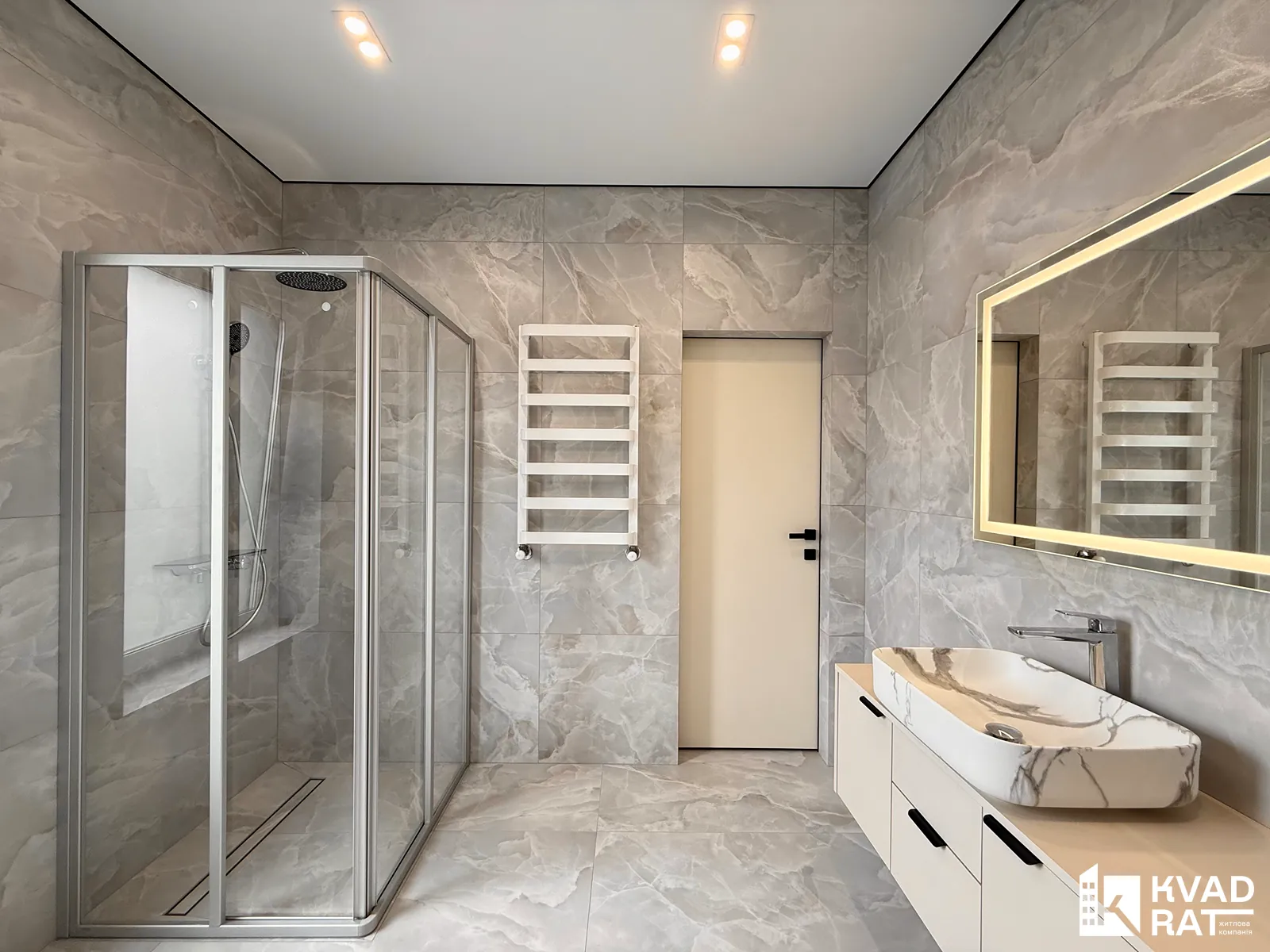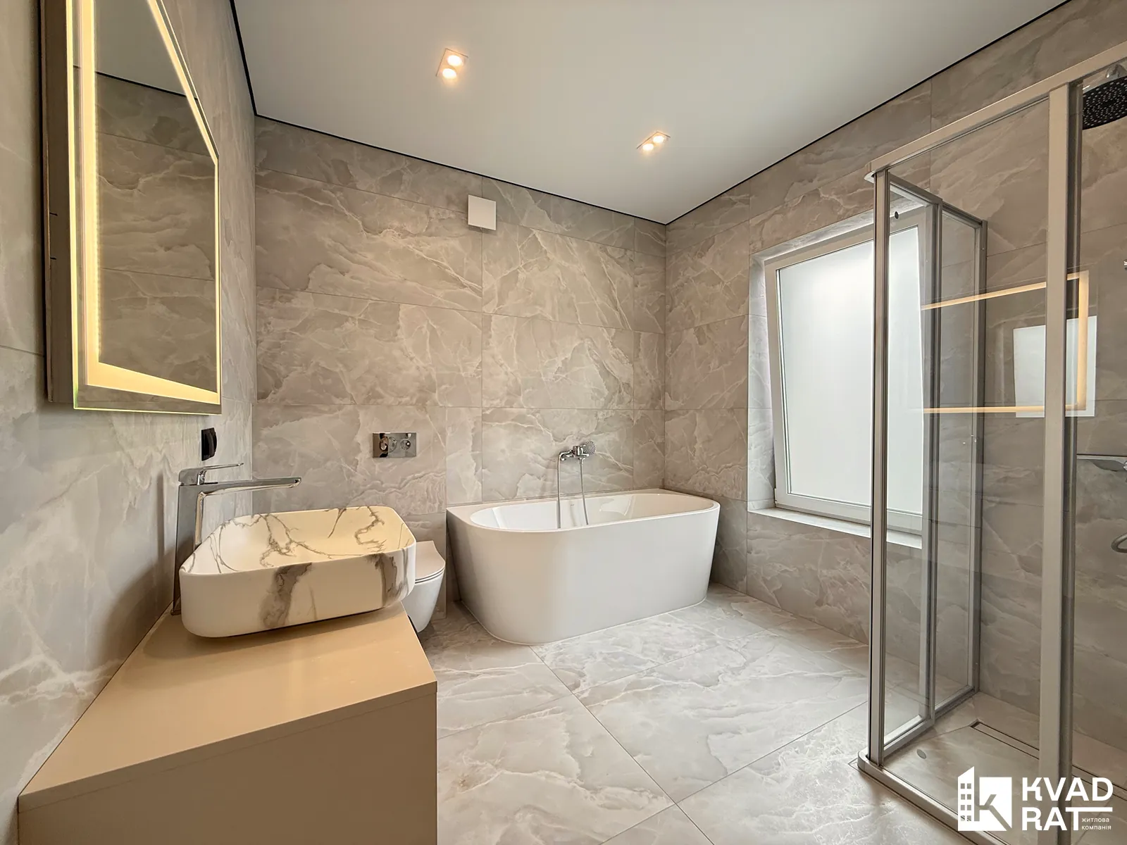 - просторий санвузол (ванна, душова кабіна, інсталяція, рукомийник, дзеркало з підсвіткою)