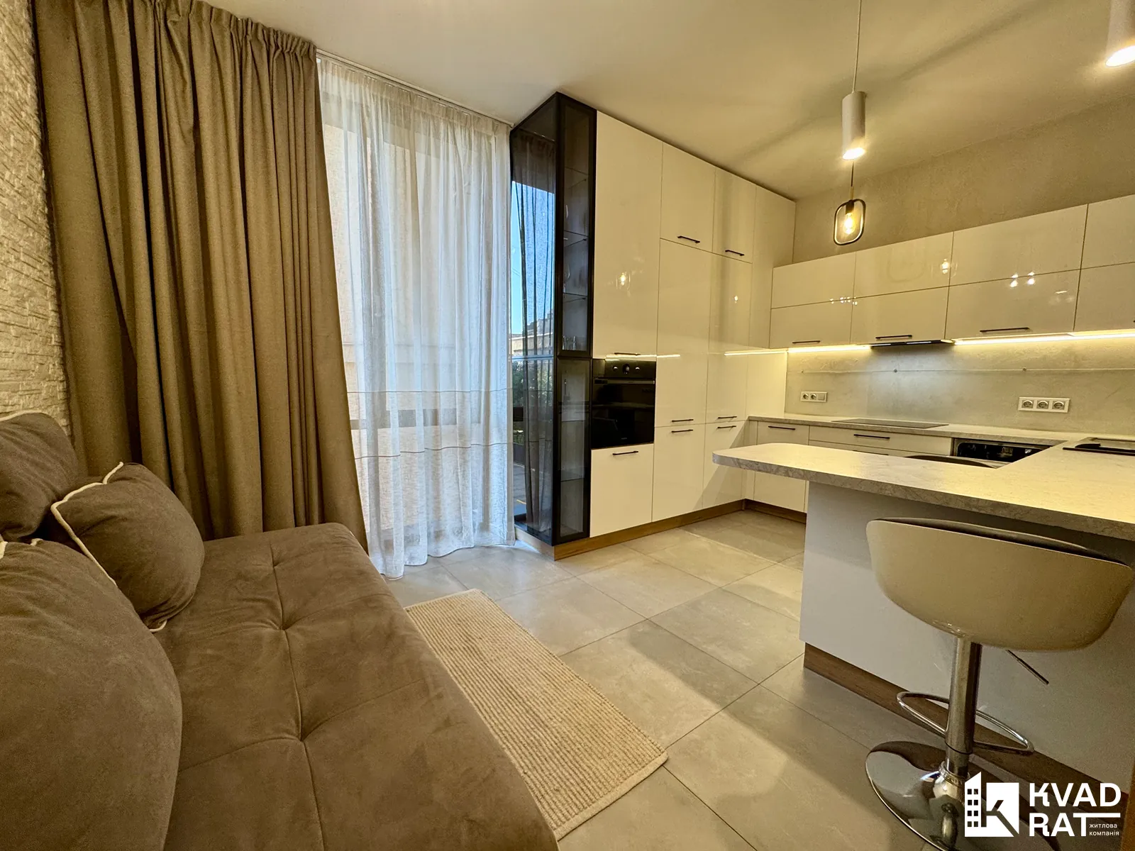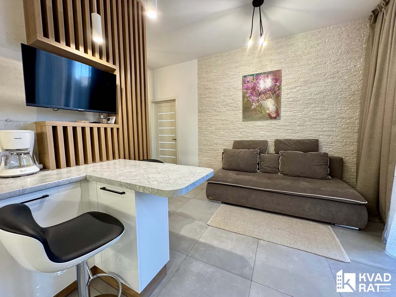 Квартира повністю обладнана всією необхідною технікою для комфортного проживання. Вдале планування з кухнею-студією створює простір та затишок.