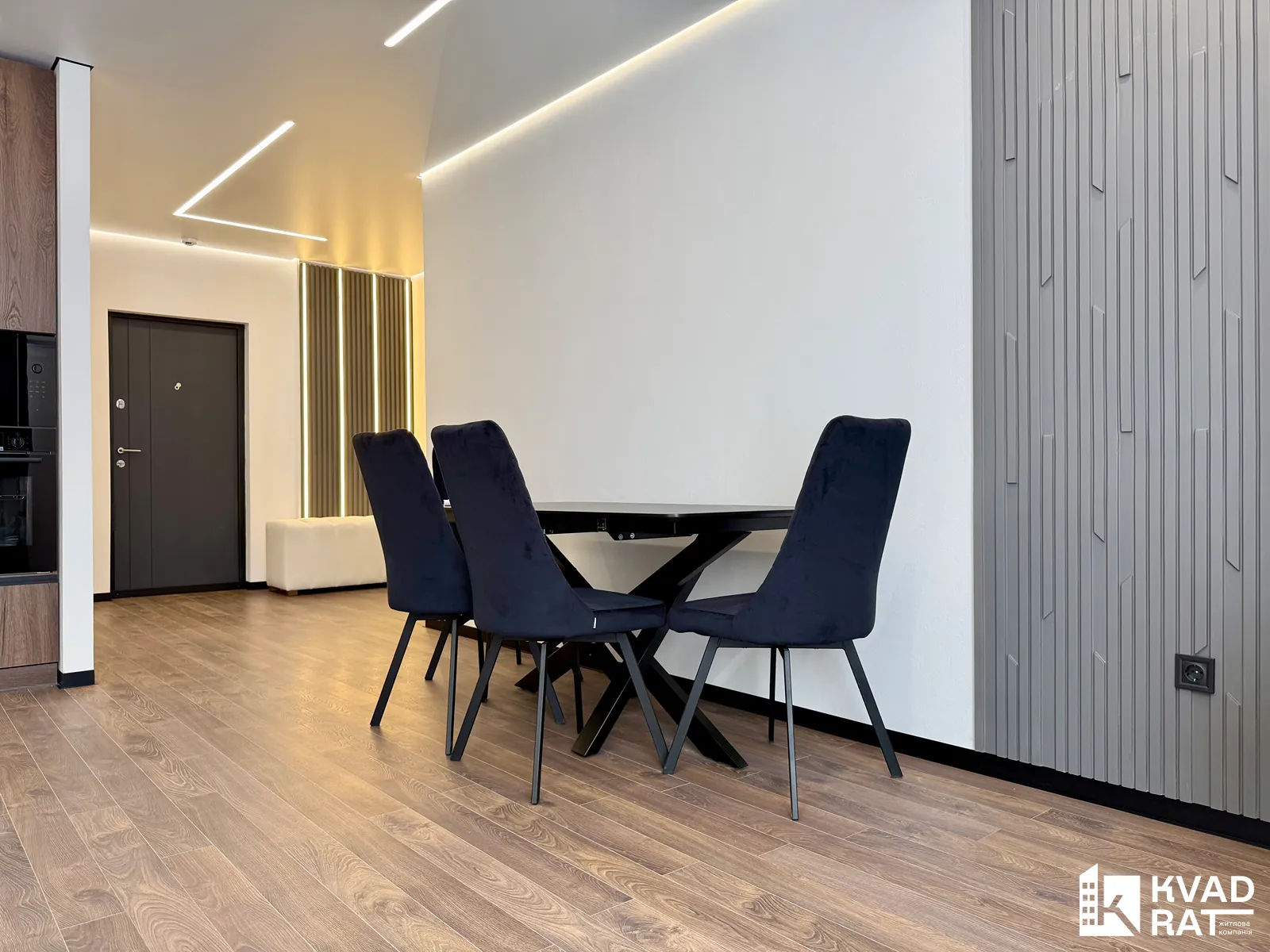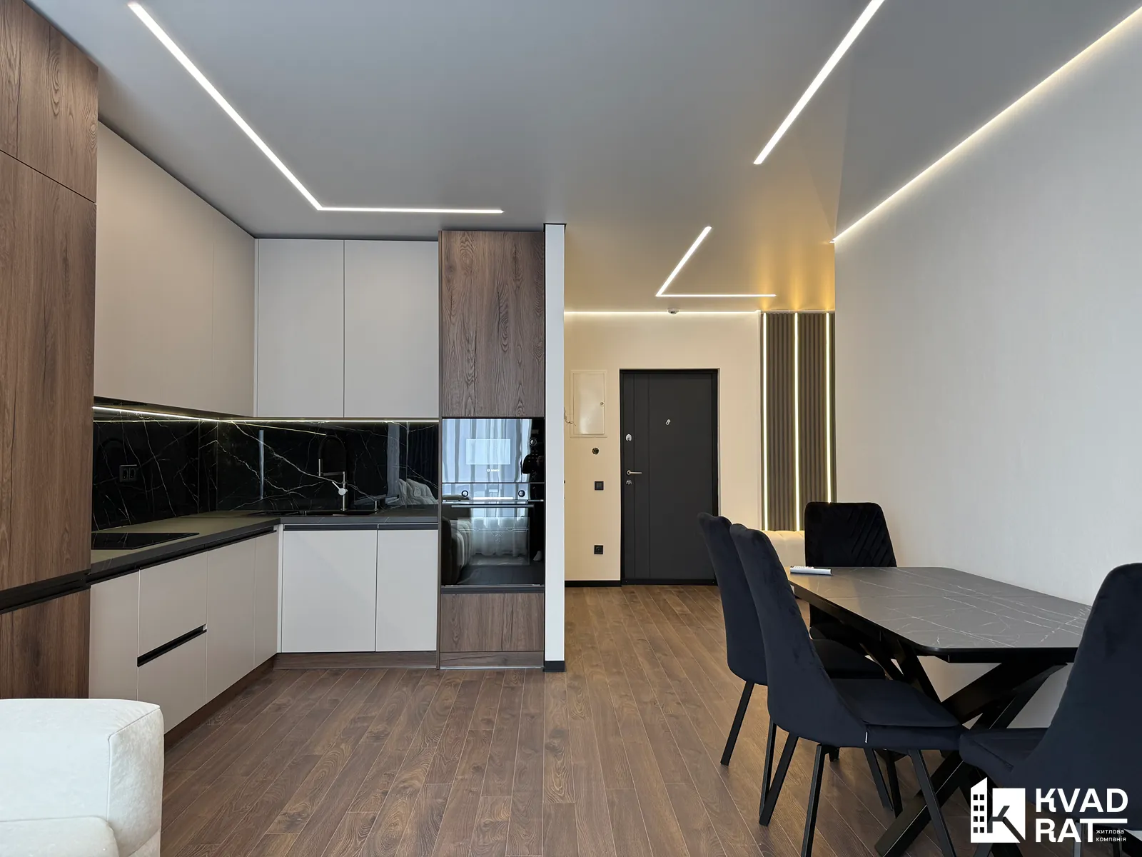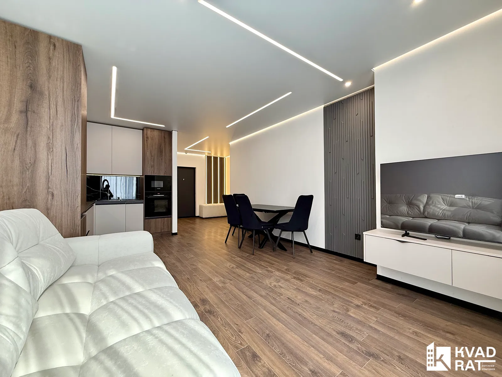 Продумане та функціональне планування: простора кухня-студія, окрема спальня, місткий гардероб та великий санвузол.