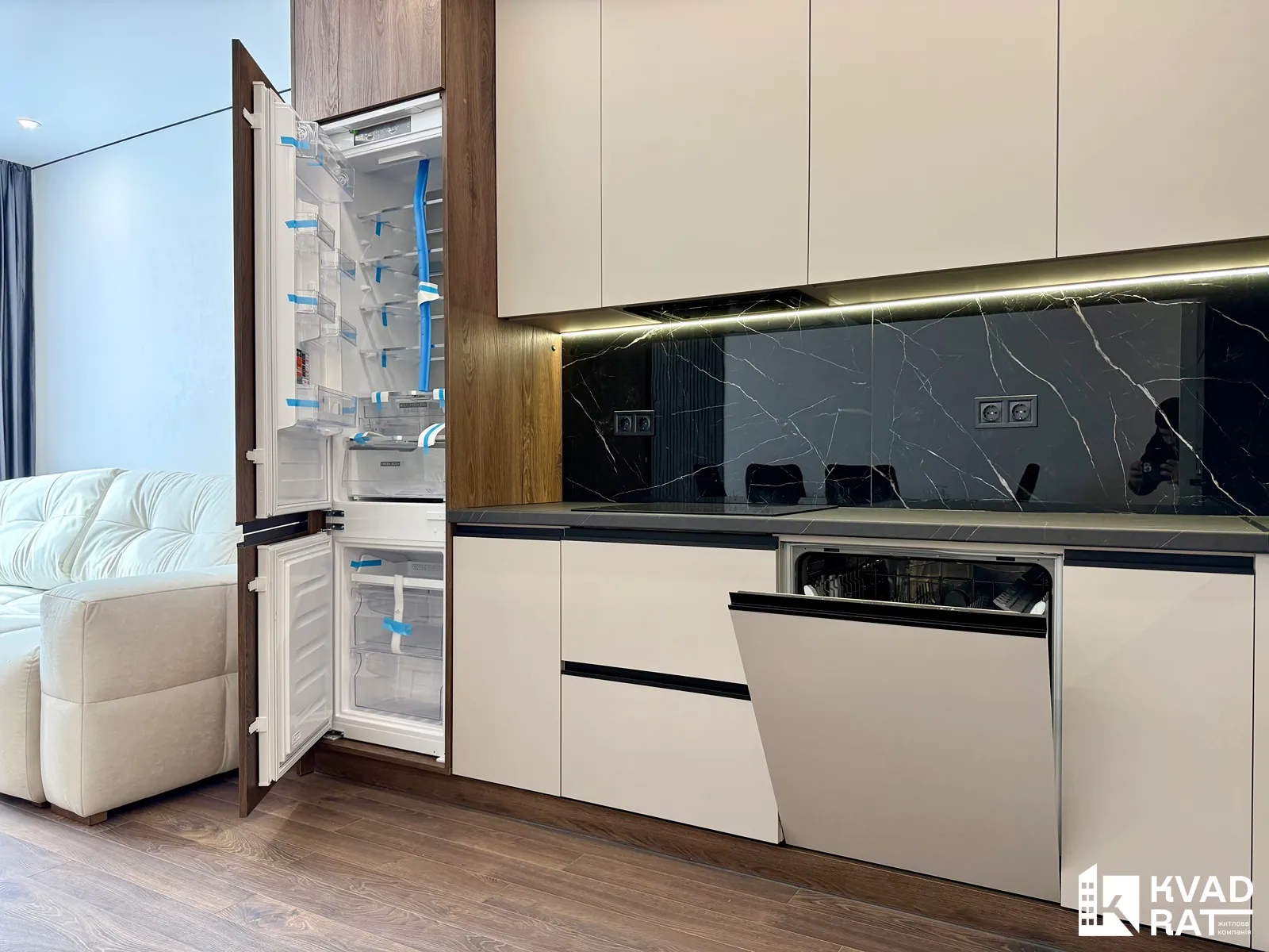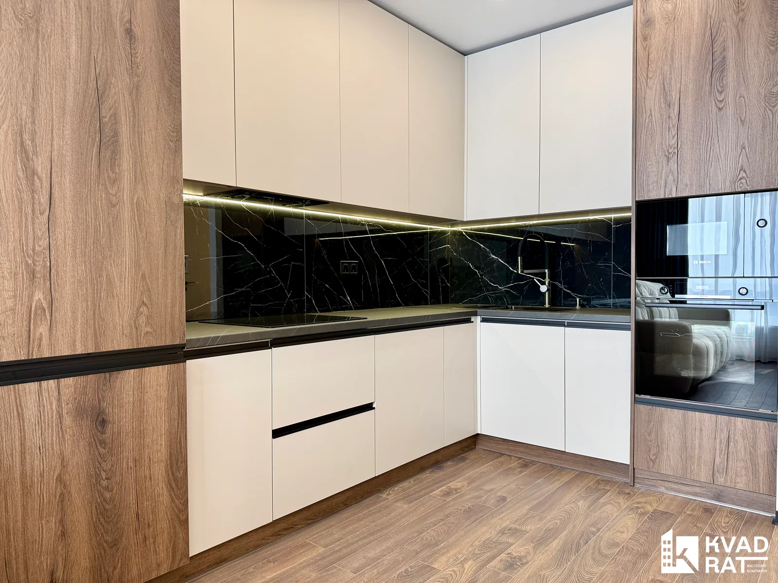 У кухні встановлені якісні меблі та вмонтована техніка від Bosch. Облаштована відпочинкова зона з диваном і телевізором. У квартирі встановлено два кондиціонери.