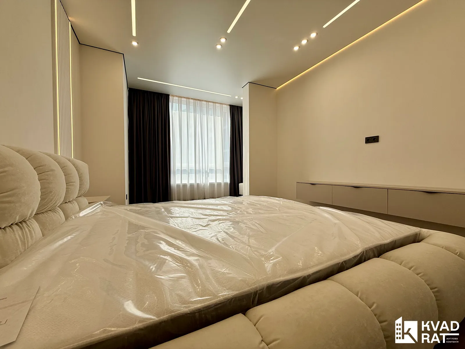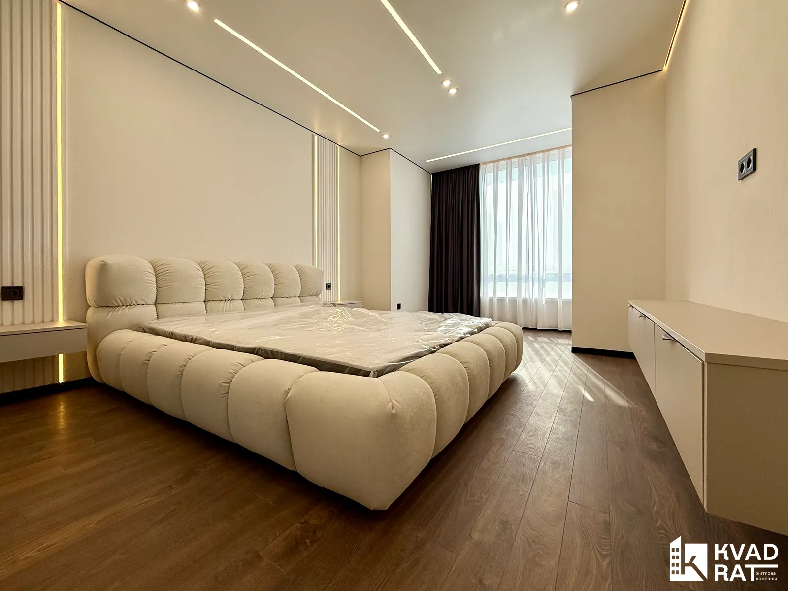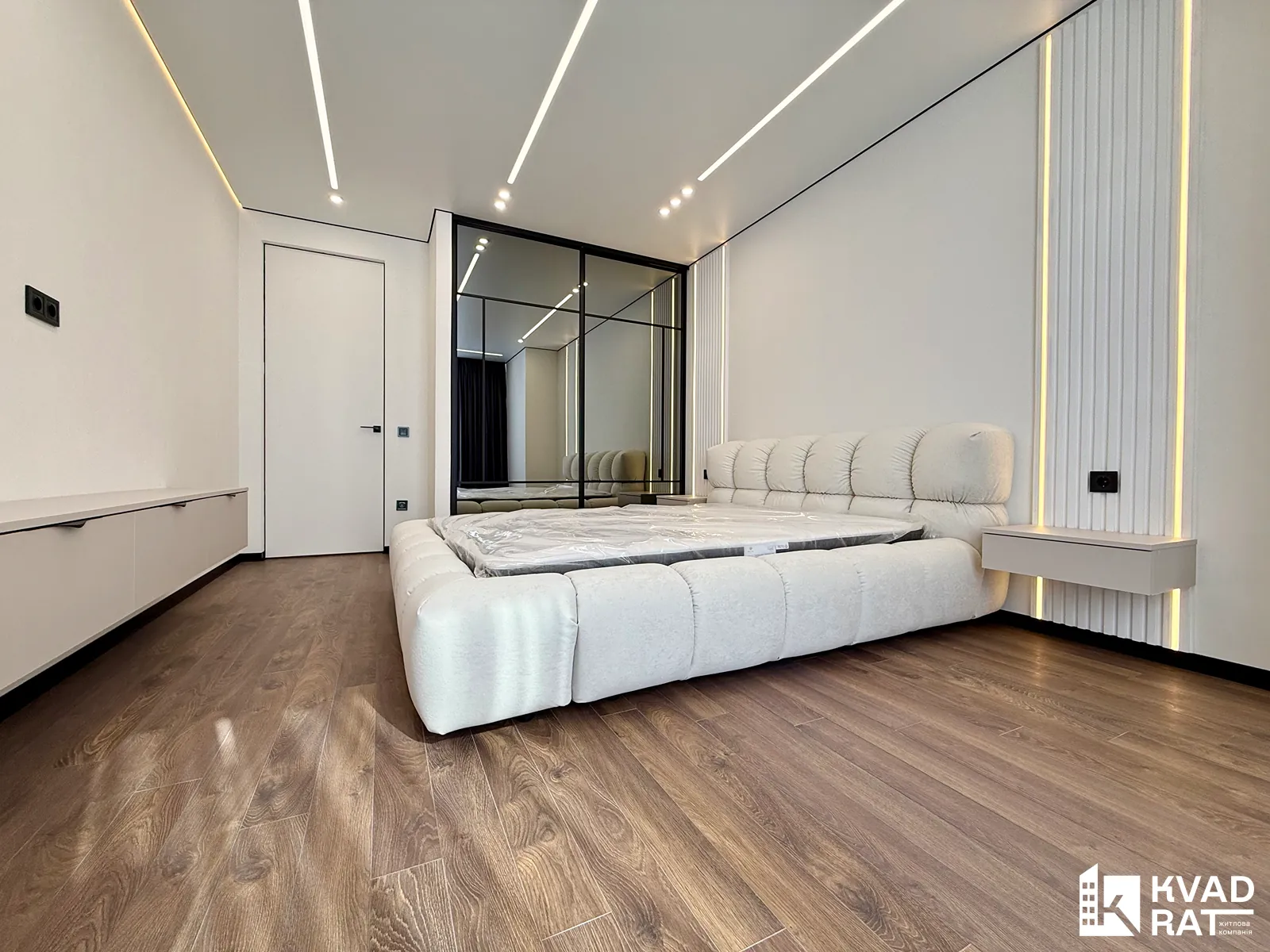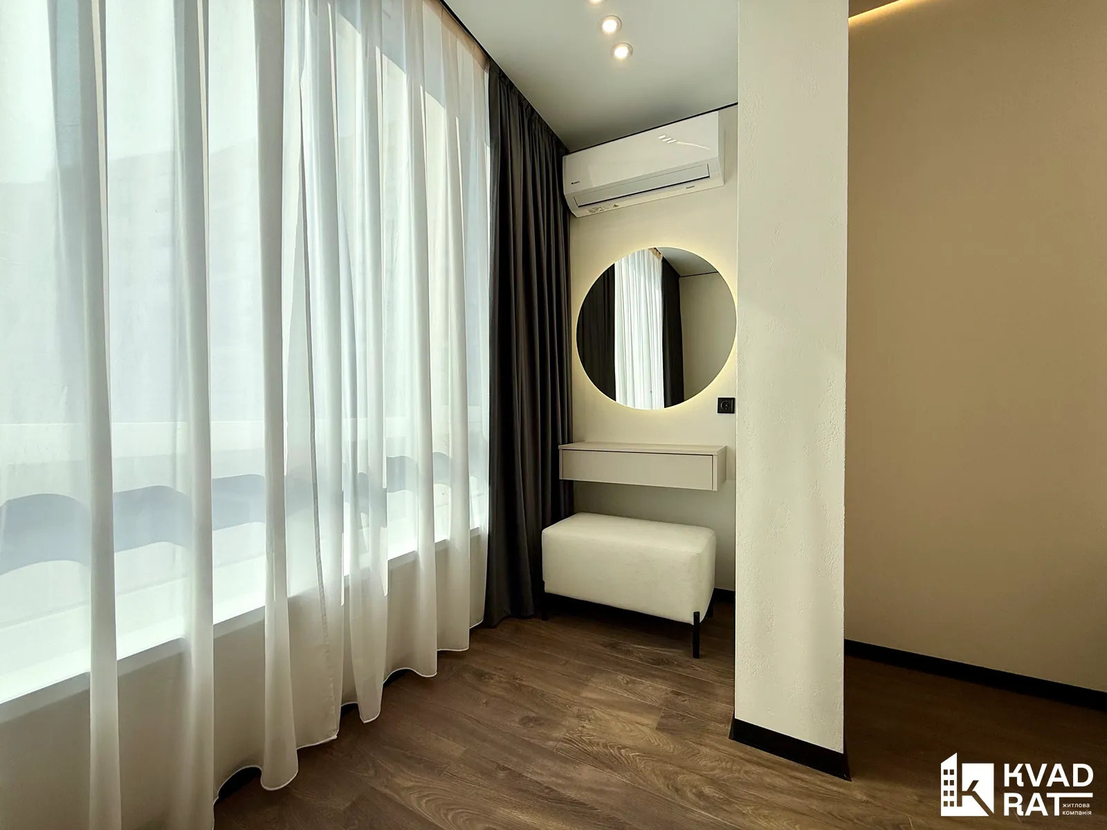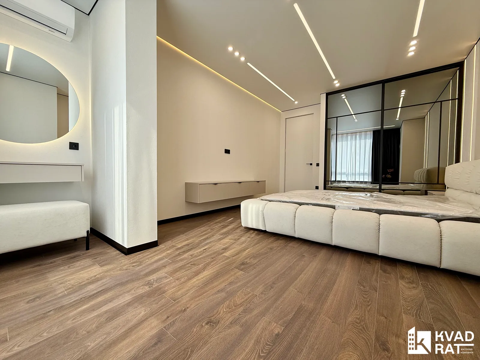 Спальня укомплектована великим двоспальним ліжком, облаштованою бюті-зоною та вмонтованою шафою.