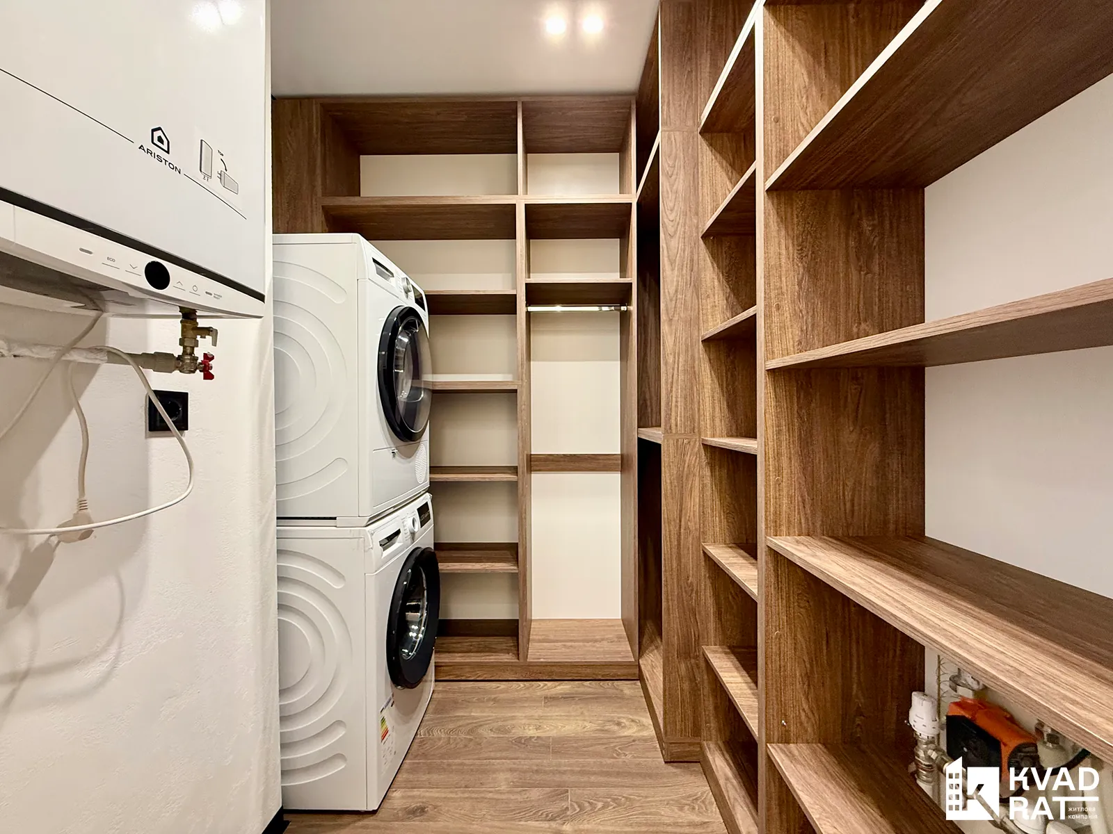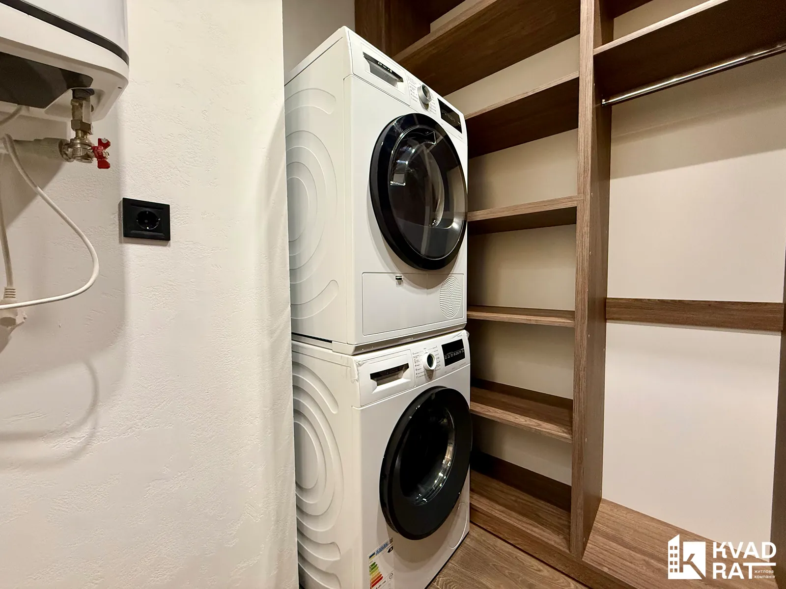 Окремий гардероб обладнаний пральною та сушильною машинами Bosch, що додає зручності у повсякденному житті.