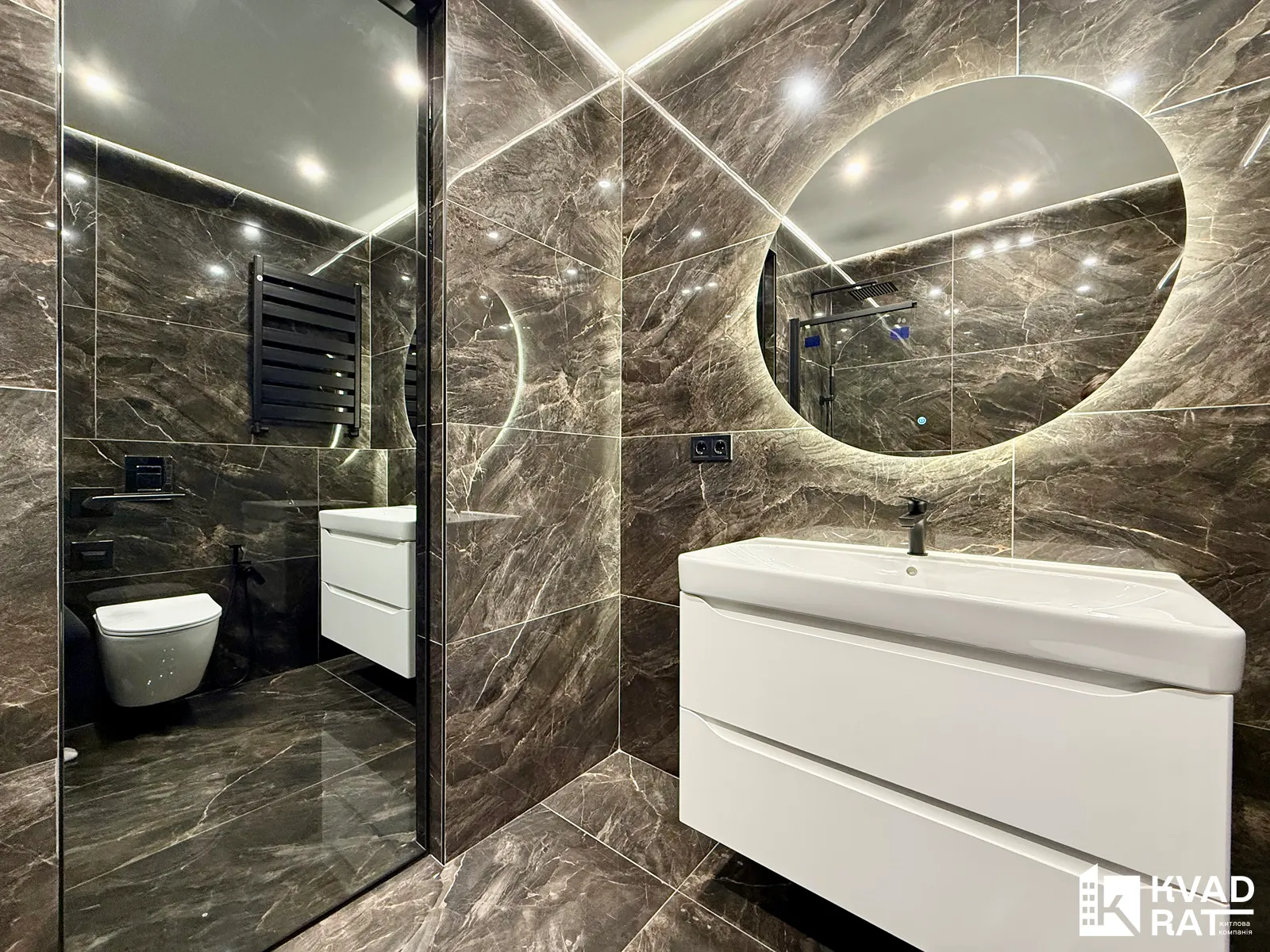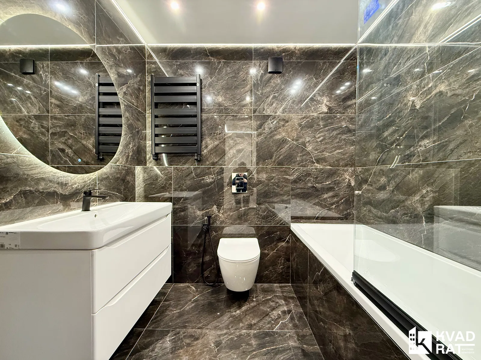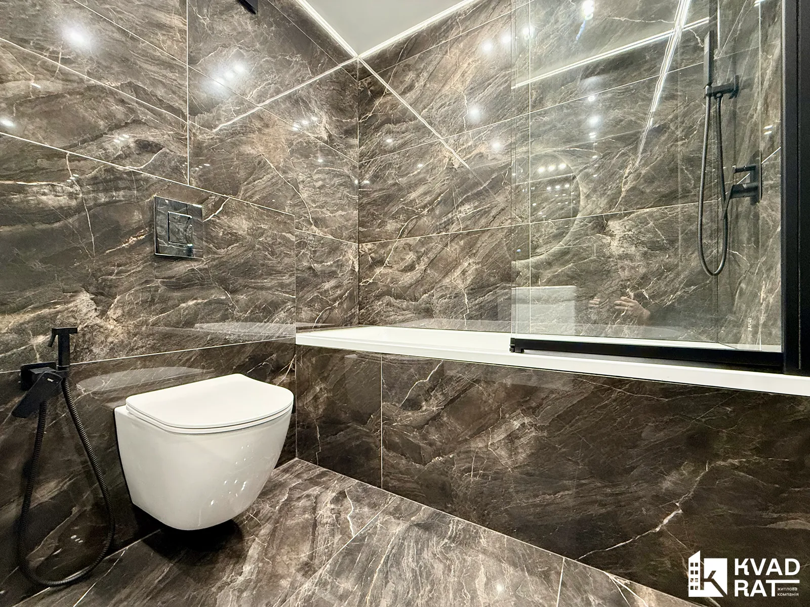 Санвузол просторий: велика ванна з тропічним душем, інсталяція, рукомийник та дзеркало.