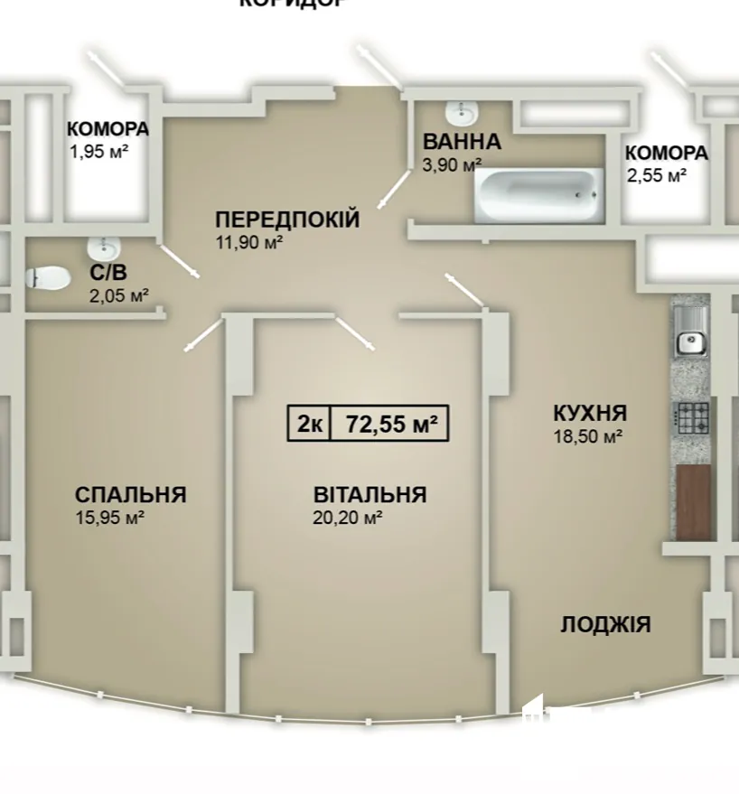 Пропонуємо простору 2-кімнатну квартиру в сучасному житловому комплексі бізнес-класу «Листопад».
