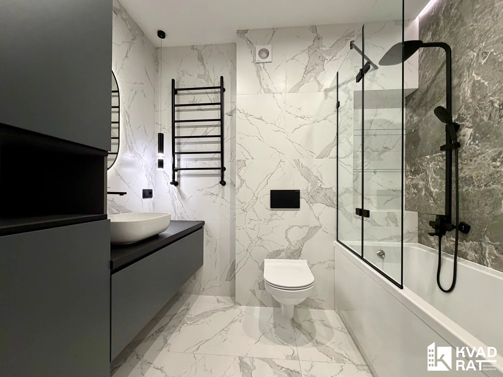 Квартира з функціональним плануванням: простора кухня студія, дві окремі кімнати, гардероб, суміжний санвузол з ванною та велика вхідна зона.