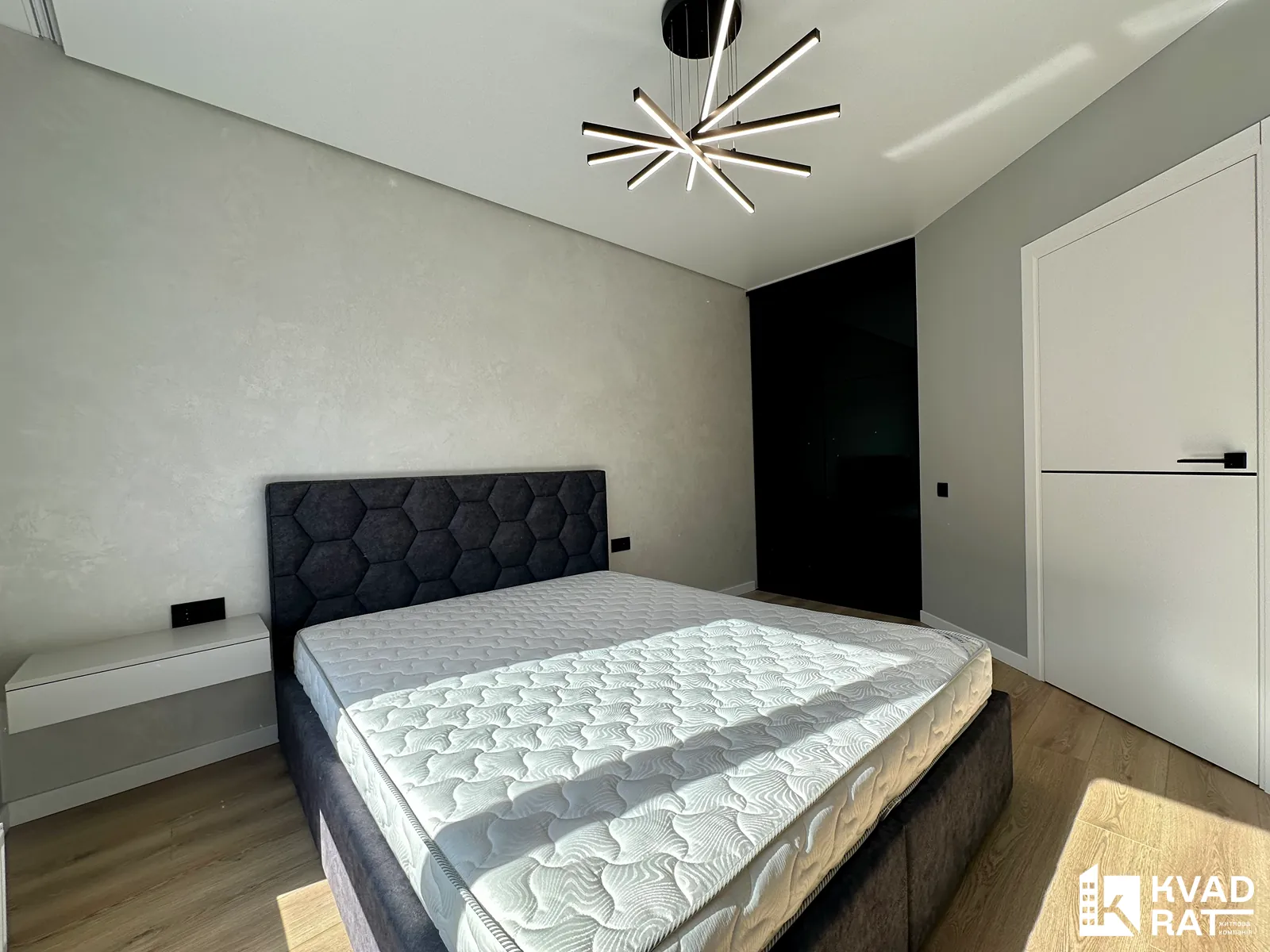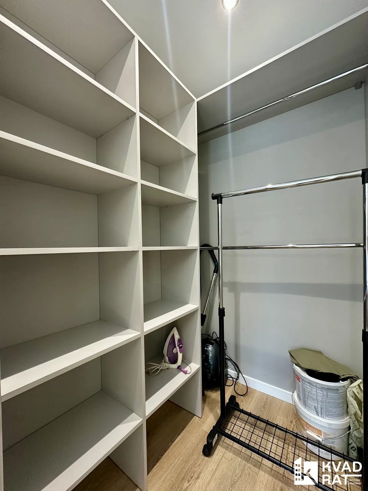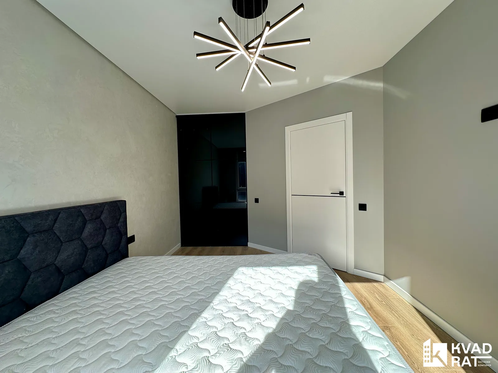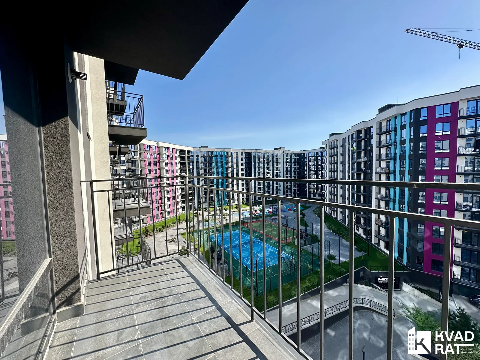 Кухня з виходом на відкритий балкою з виглядом у внутрішній двір житлового комплексу та окрема спальня з просторою гардеробною