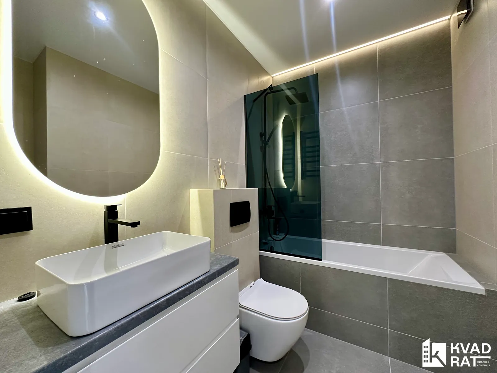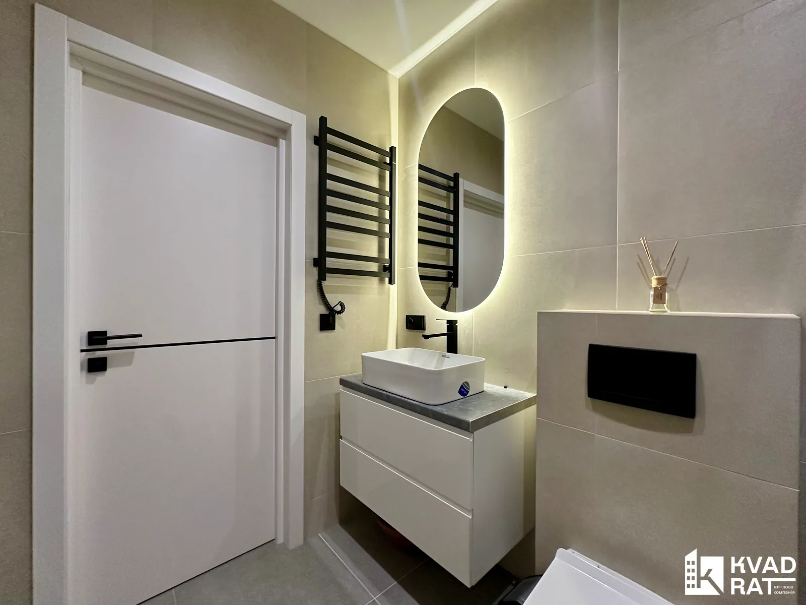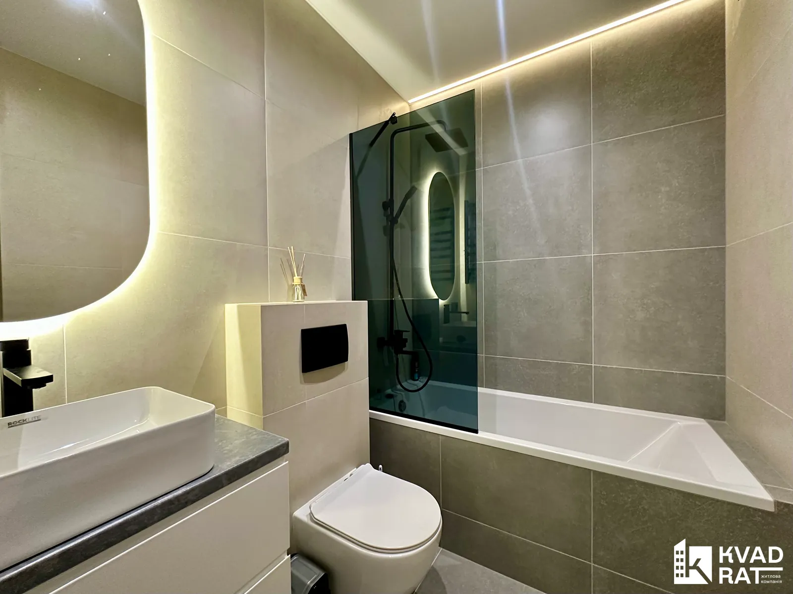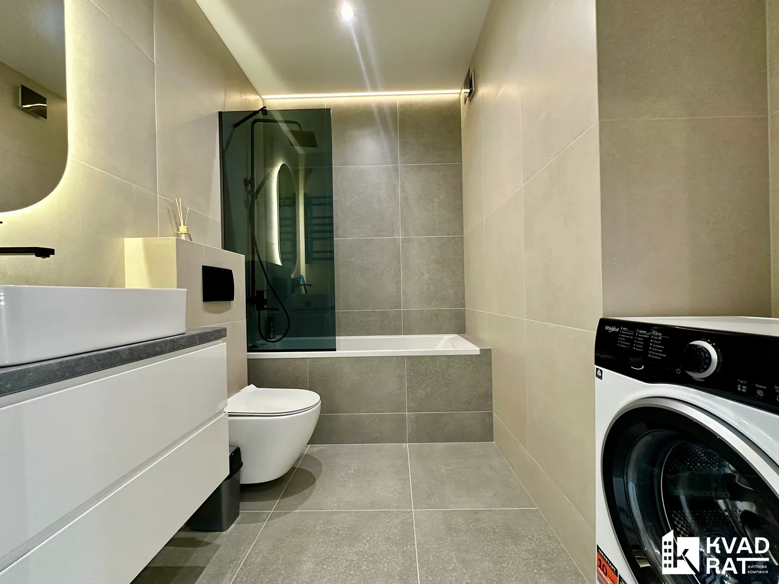 Кухня з виходом на відкритий балкою з виглядом у внутрішній двір житлового комплексу та окрема спальня з просторою гардеробною