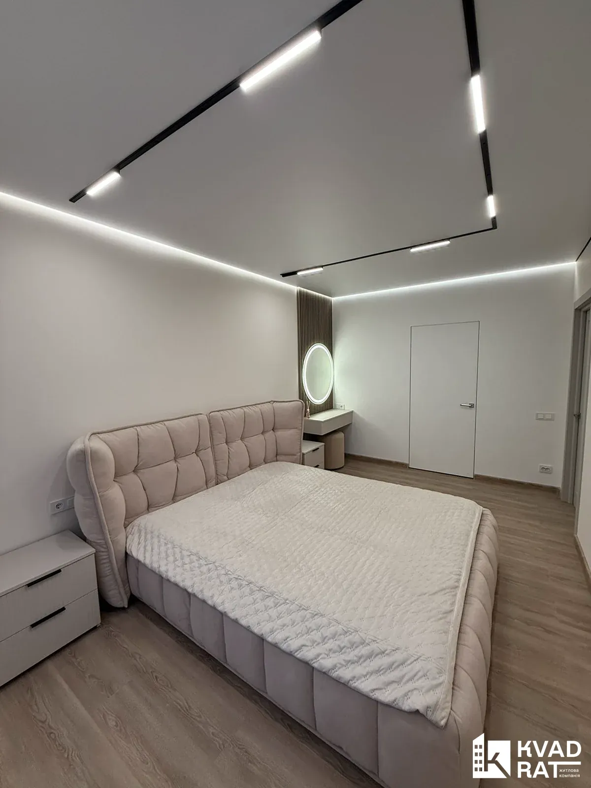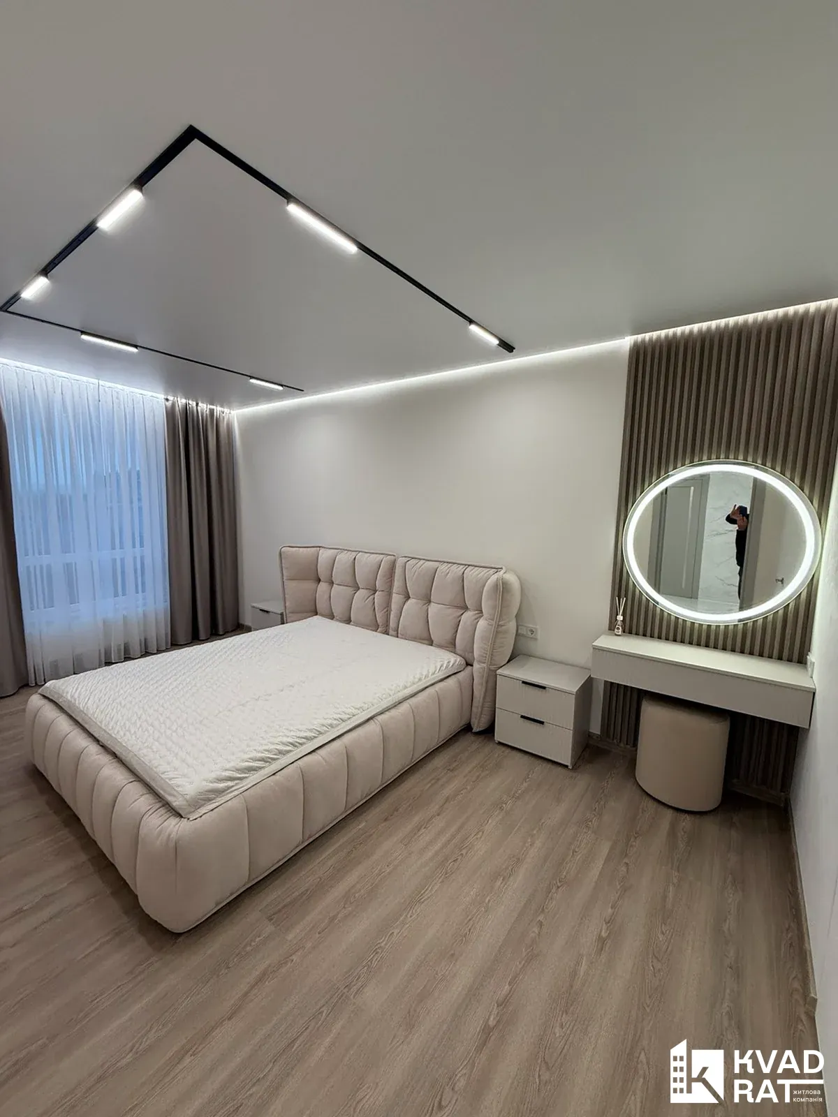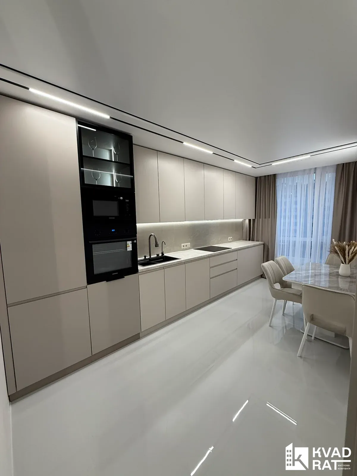 Ремонт виконаний у світлих та природніх кольорах, багато декору, стеля комбінована із гіпсокартону та натяжної стелі із трековим освітленням, скритими карнизами, по підлозі керамограніт 1.2 на 0.6 і звісно є підігрів підлоги, у кімнатах ламінат, двері скритого монтажу...