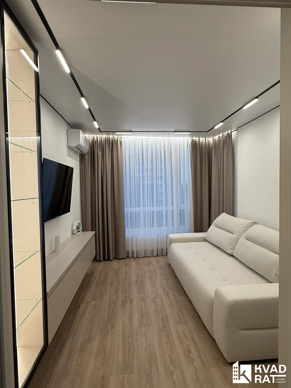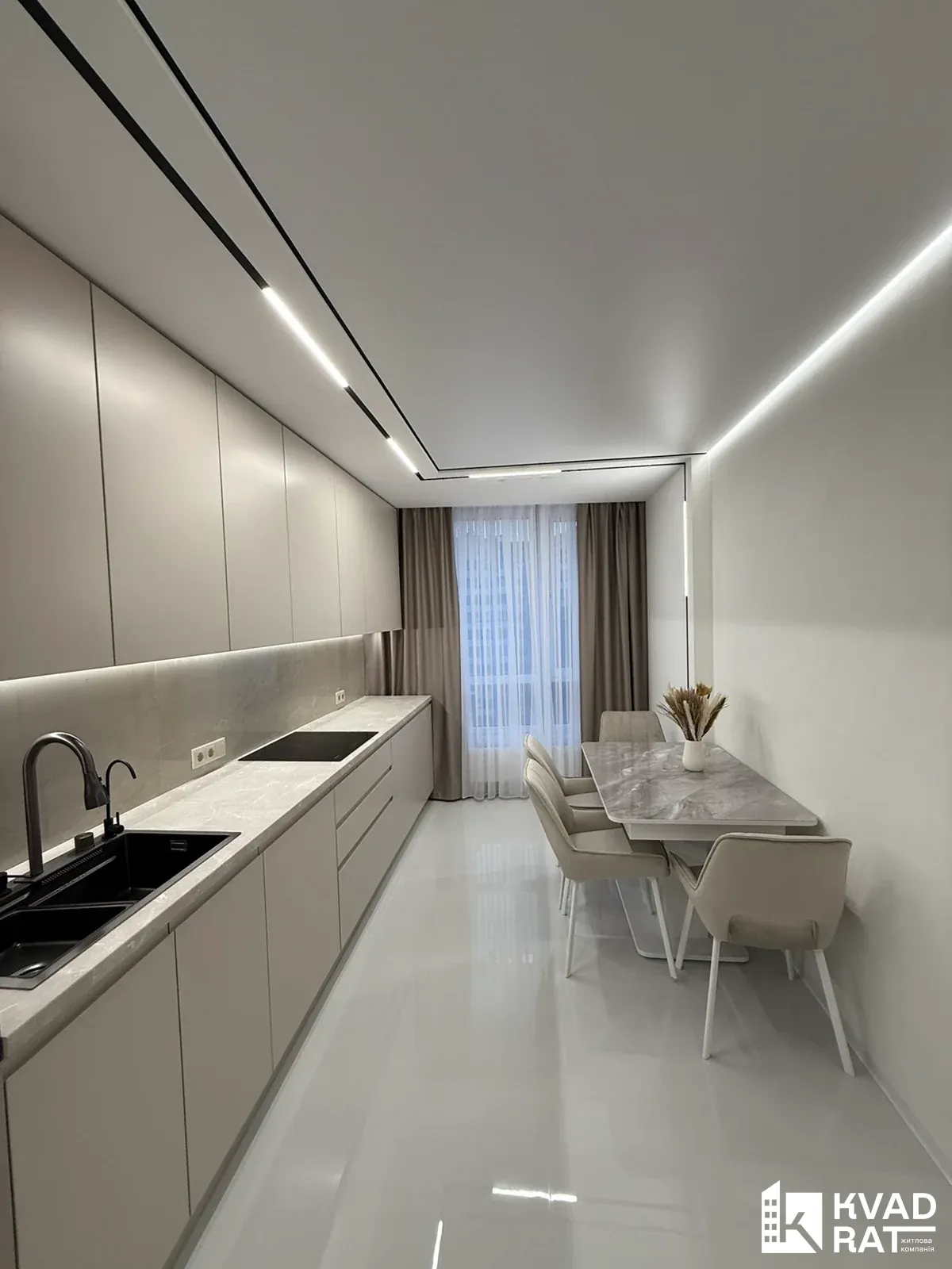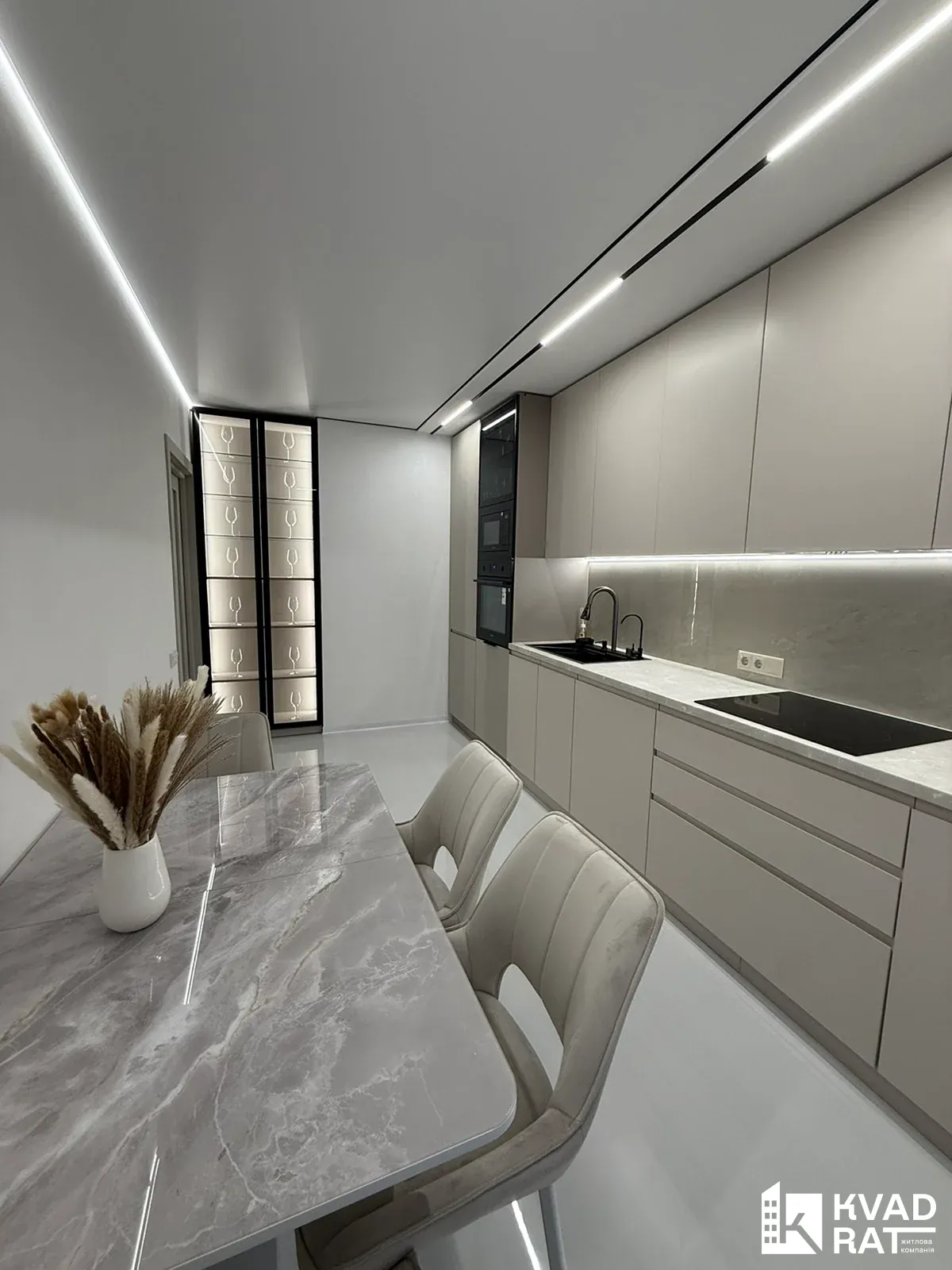 Ремонт виконаний у світлих та природніх кольорах, багато декору, стеля комбінована із гіпсокартону та натяжної стелі із трековим освітленням, скритими карнизами, по підлозі керамограніт 1.2 на 0.6 і звісно є підігрів підлоги, у кімнатах ламінат, двері скритого монтажу...