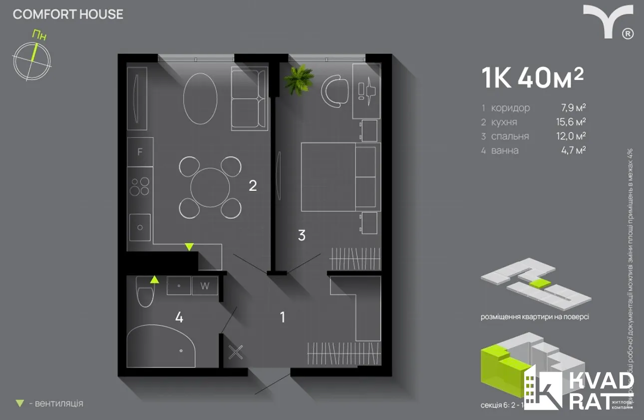 Площа 40 м2, зручний 4 поверх,квартира правильної форми з великою кухнею,панорамними вікнами.