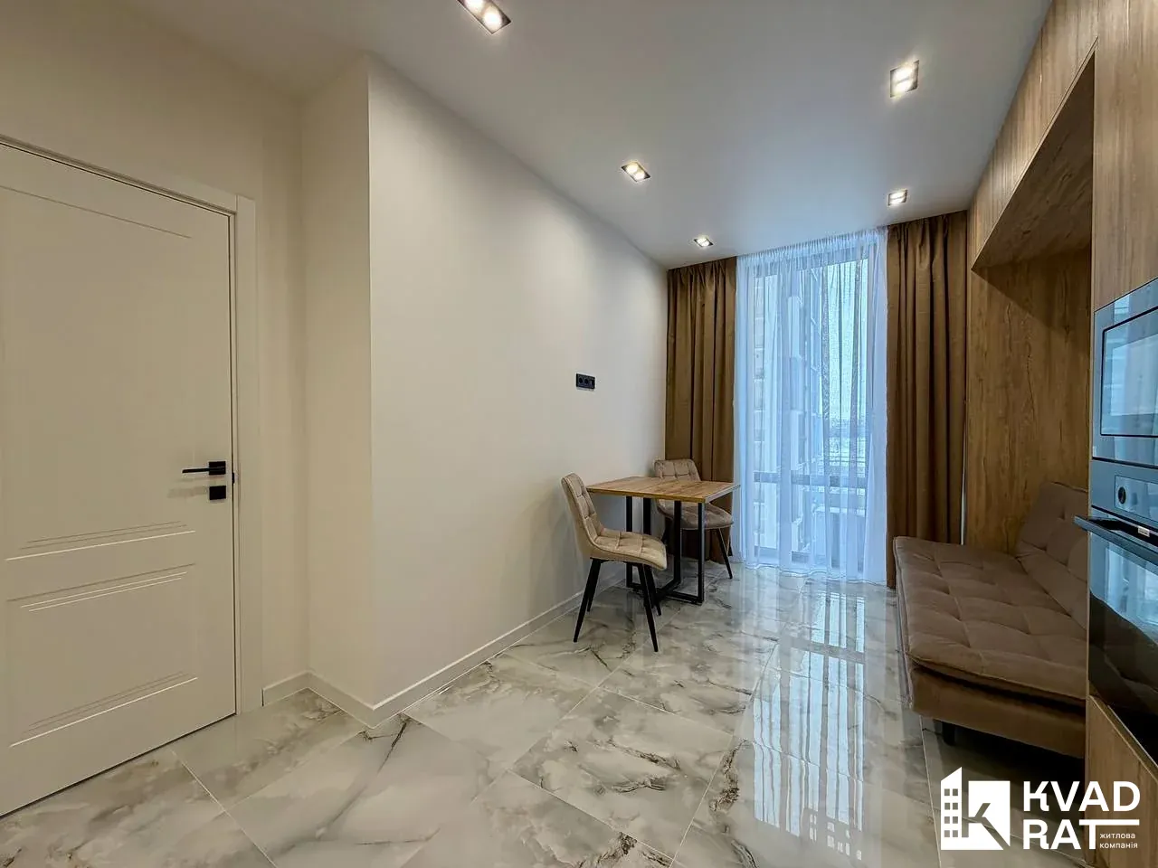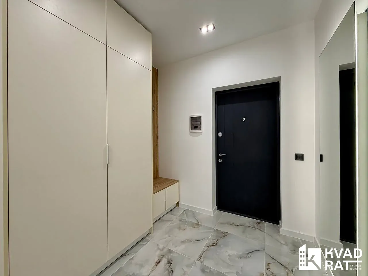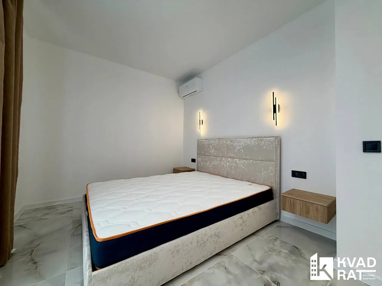 Квартира площею 44 м2 вдало перепланована у кухню-студію з видом на озеро, простору спальню кімнату з відкритим балконом, який виходить у внутрішній двір також є ніша під гардероб. Суміжний санвузол із ванною та вхідна зона із шафою та дзеркалом у повний ріст.