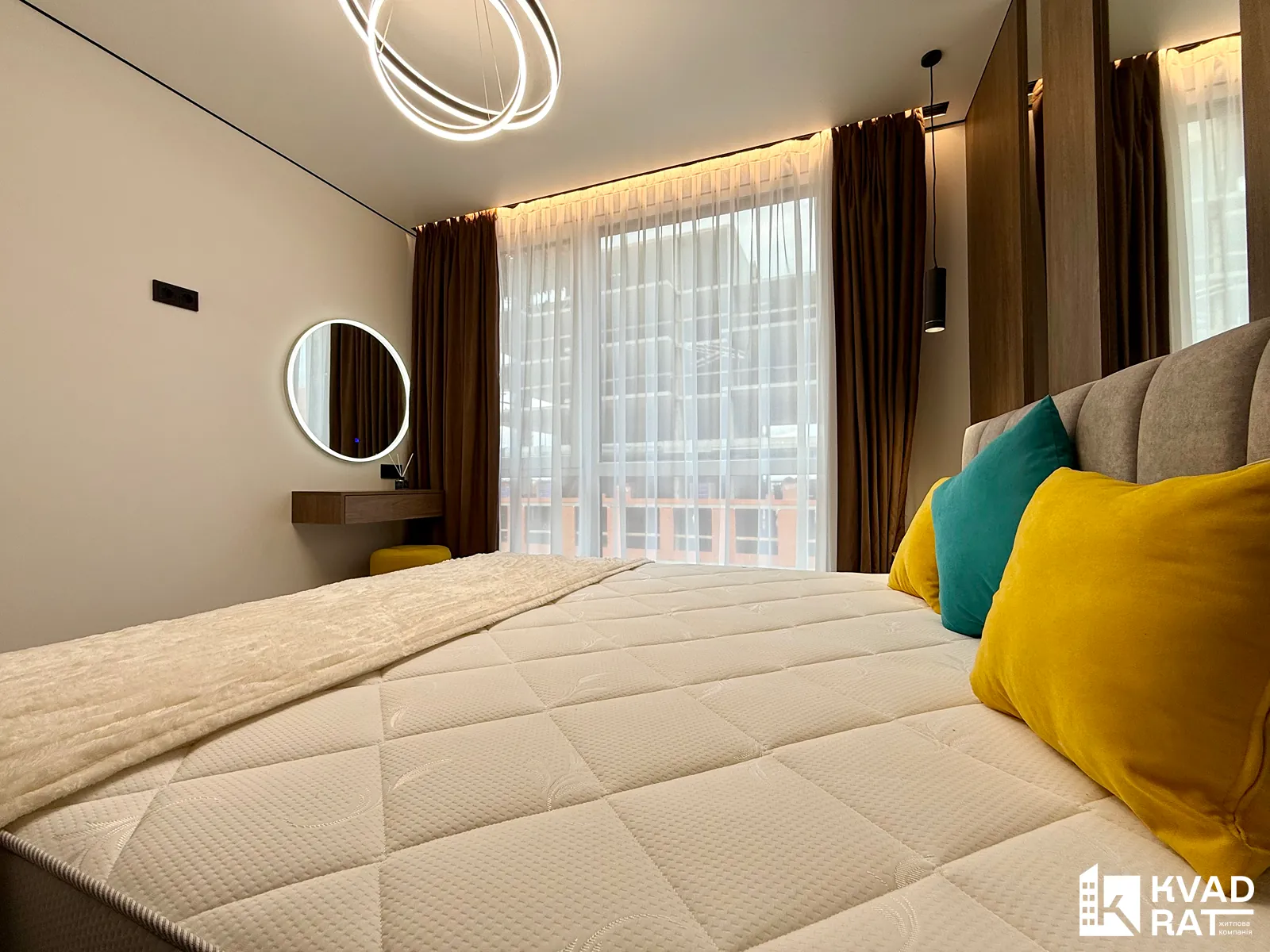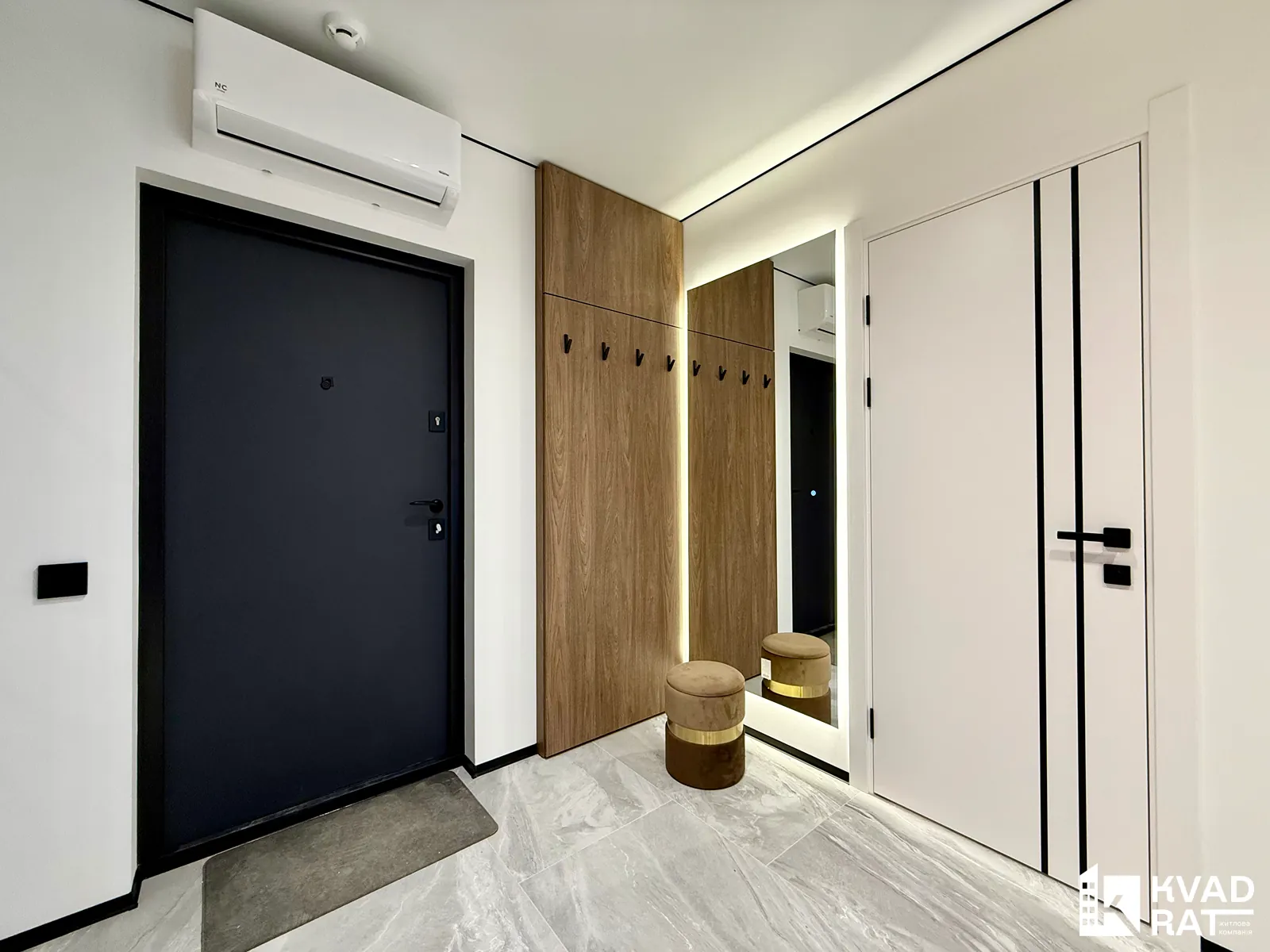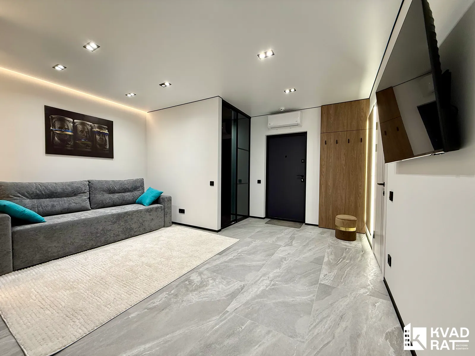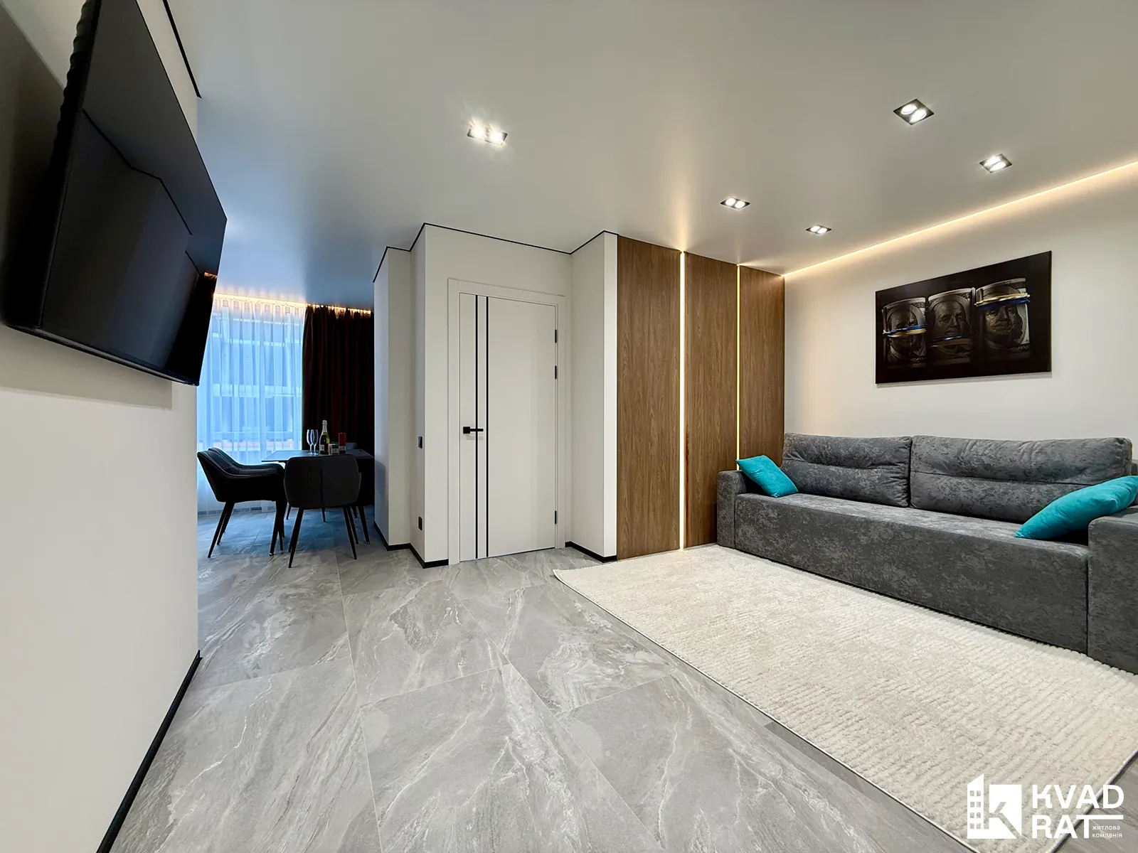 Квартира з якісним дизайнерським ремонтом, виконаним із використанням дорогих матеріалів. Продумане до дрібниць планування забезпечує максимальний комфорт для проживання: простора кухня, окрема спальня кімната, гардеробна, затишна зона відпочинку з розкладним диваном і телевізором, містка прихожа та сучасний санвузол.