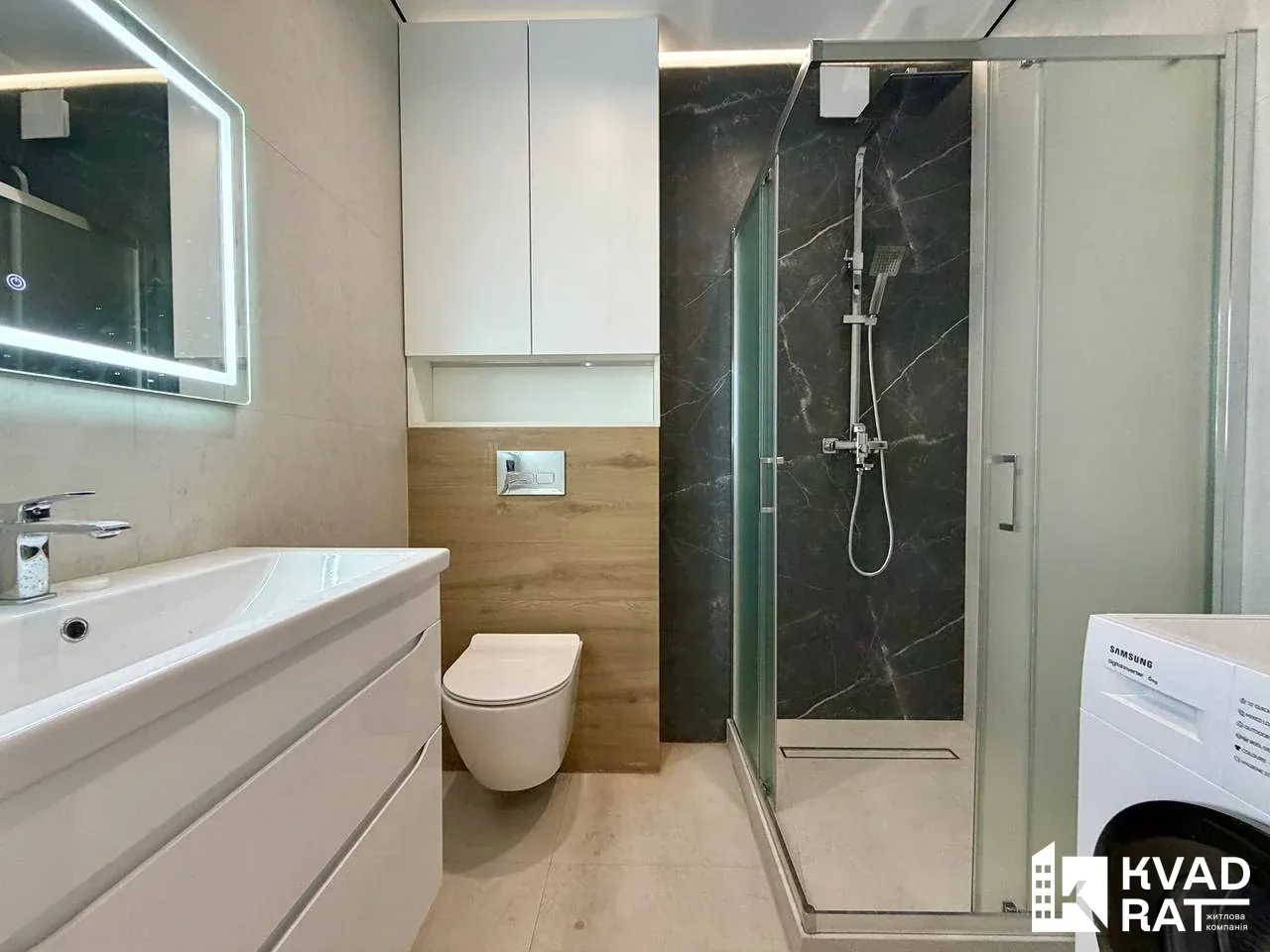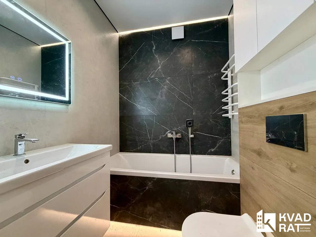 Функціональне планування: велика кухня-студія і лоджією, окремі дві кімати, роздільні санвузли, один санвузол із душовою кабіною, другий із ванною.