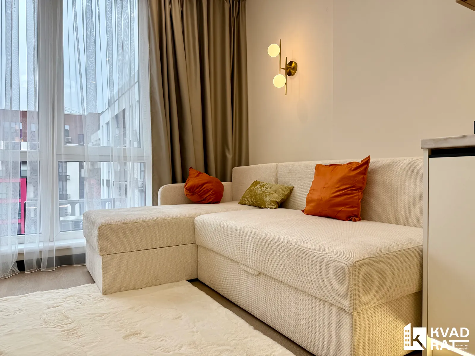 Квартира має продумане та максимально функціональне планування, яке фактично відповідає формату півторачки: простора кухня-студія, окрема спальня кімната, повноцінний гардероб та зручний санвузол.
