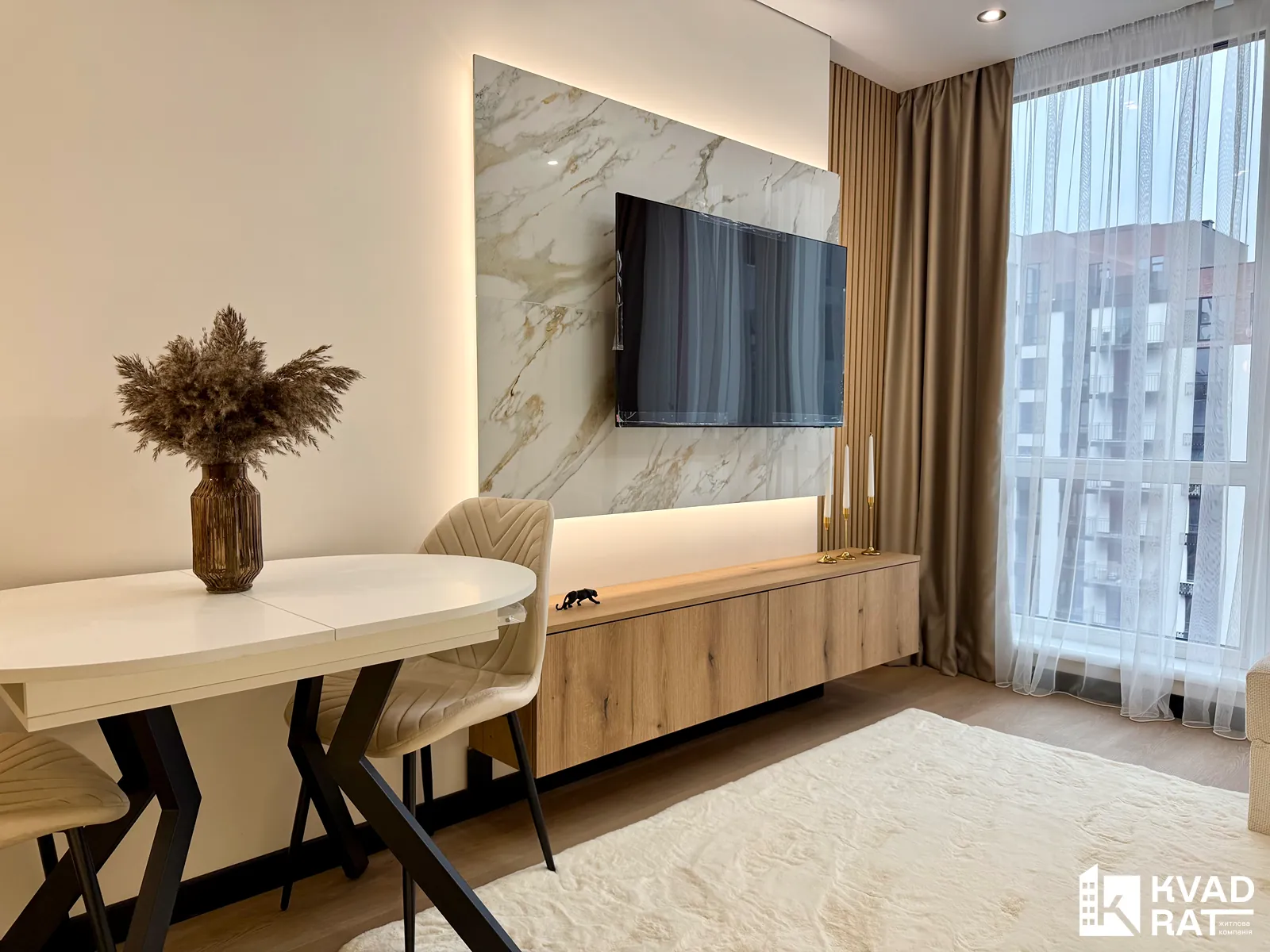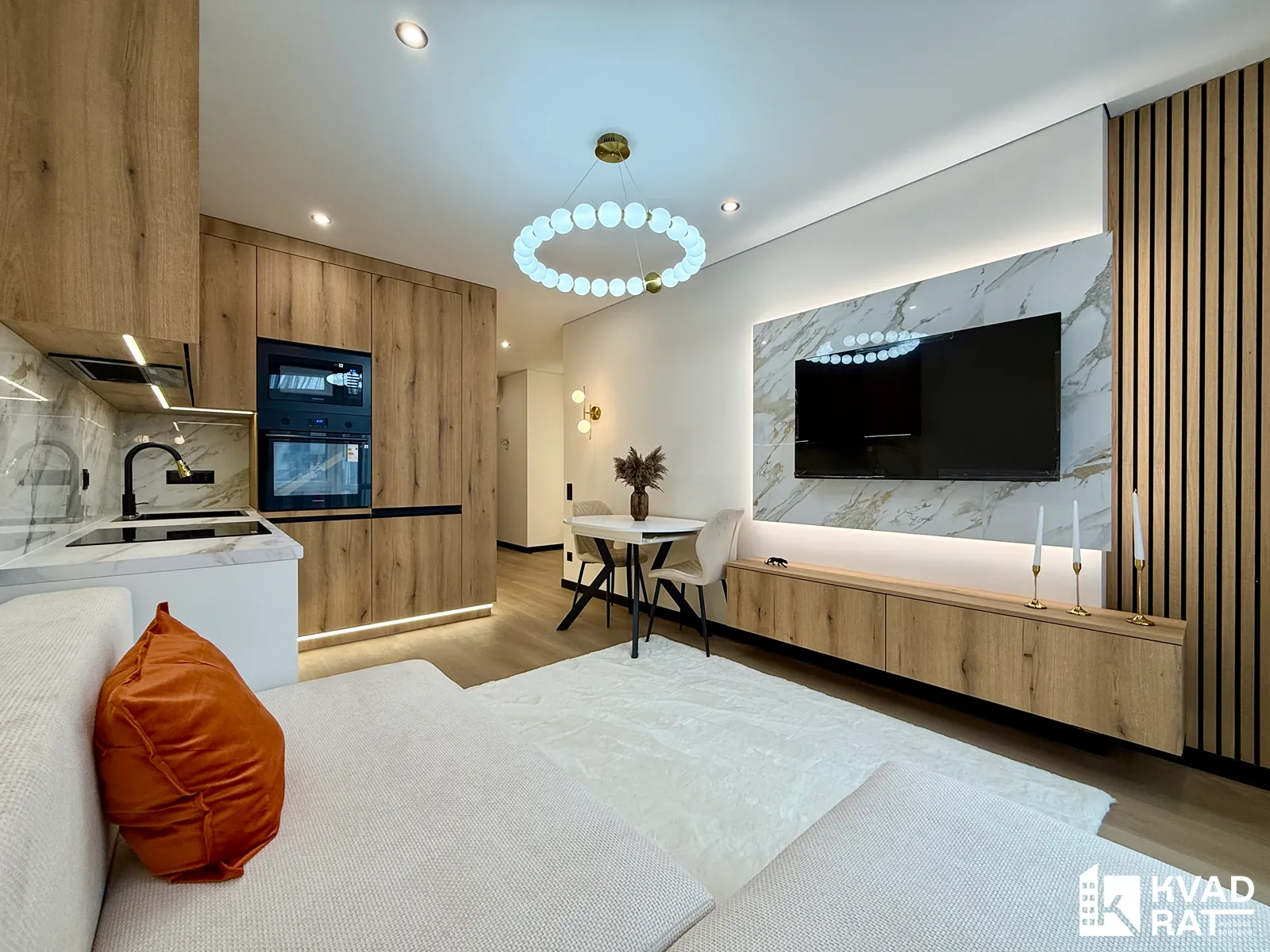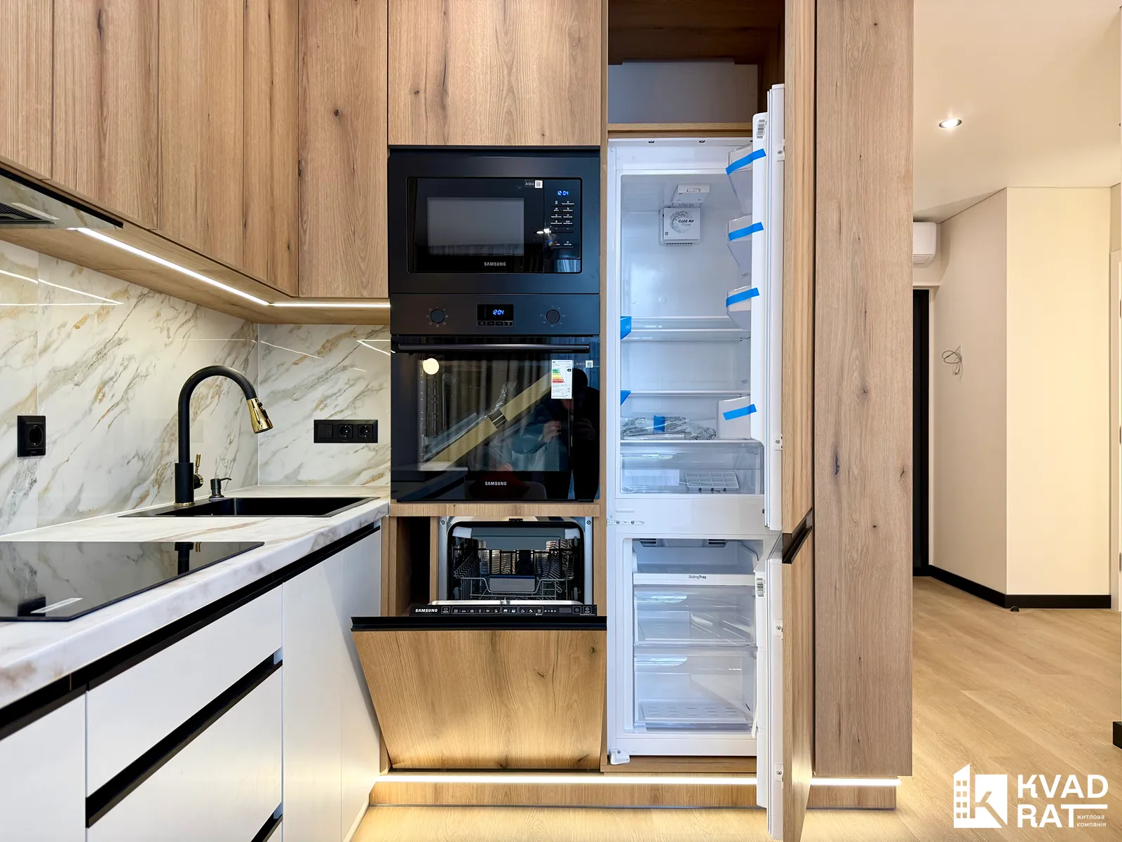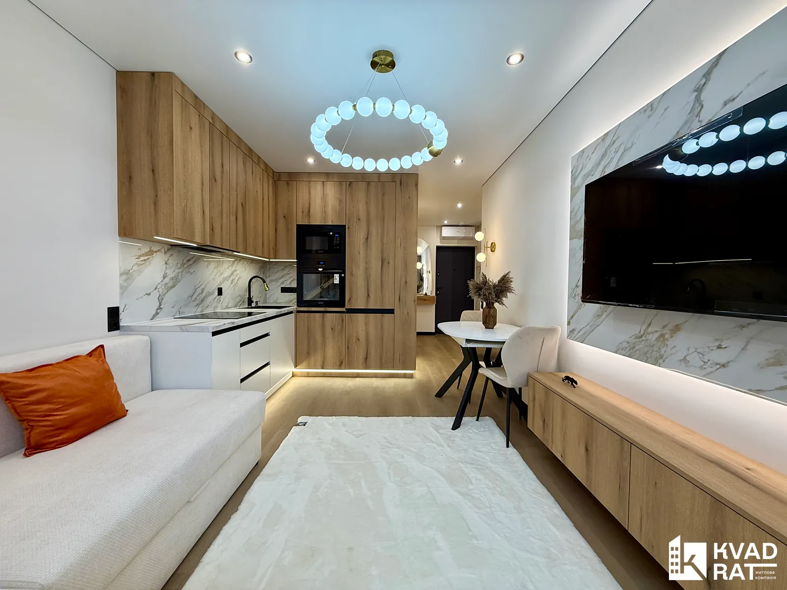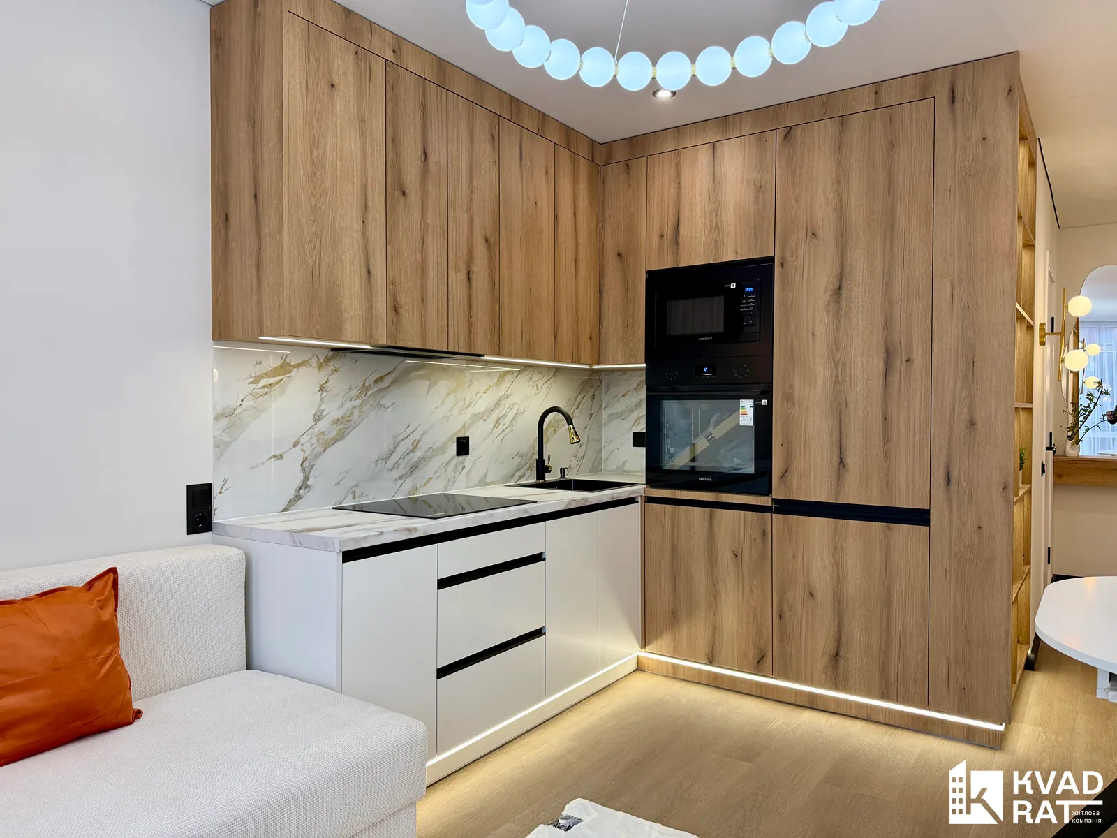 Кухня-студія облаштована великою робочою зоною та всією необхідною вбудованою технікою від Samsung, також тут розміщений кутовий розкладний диван, телевізор та комфортна обідня зона.