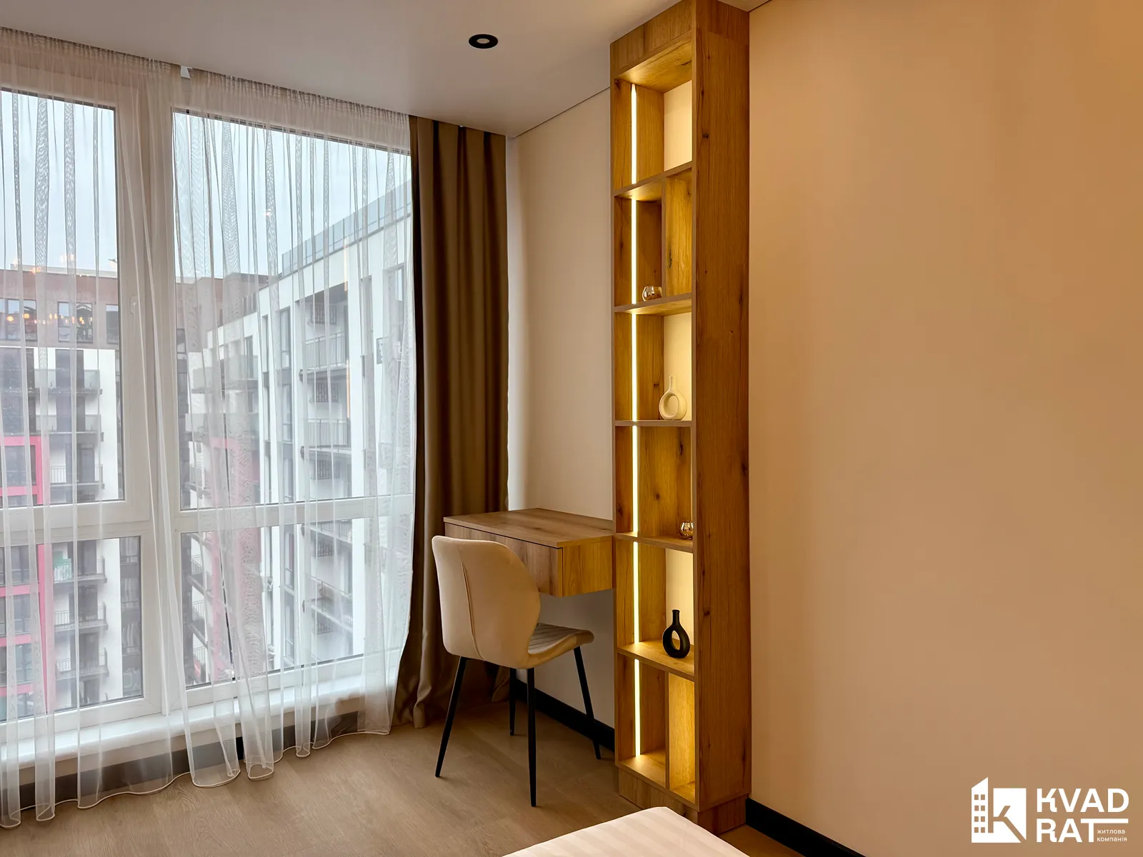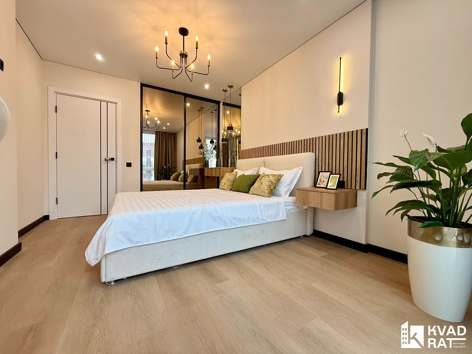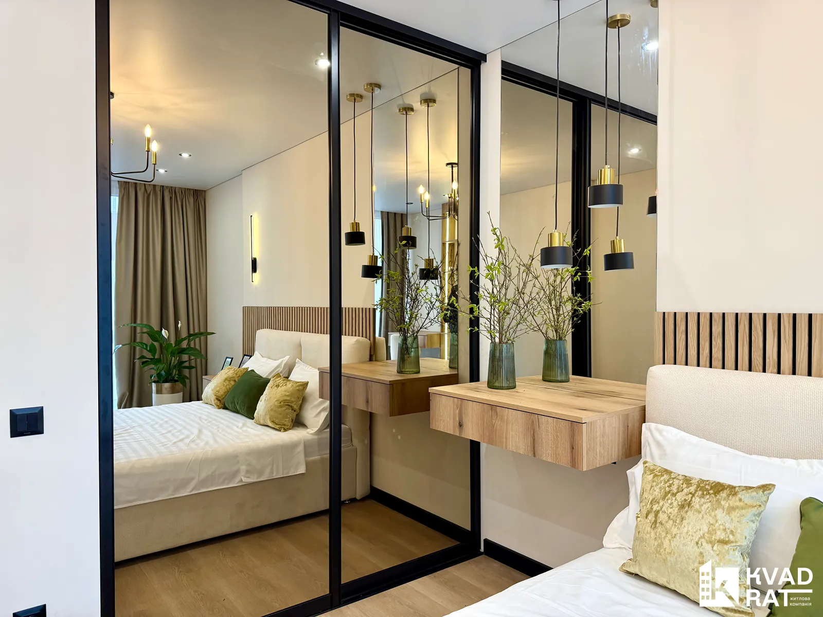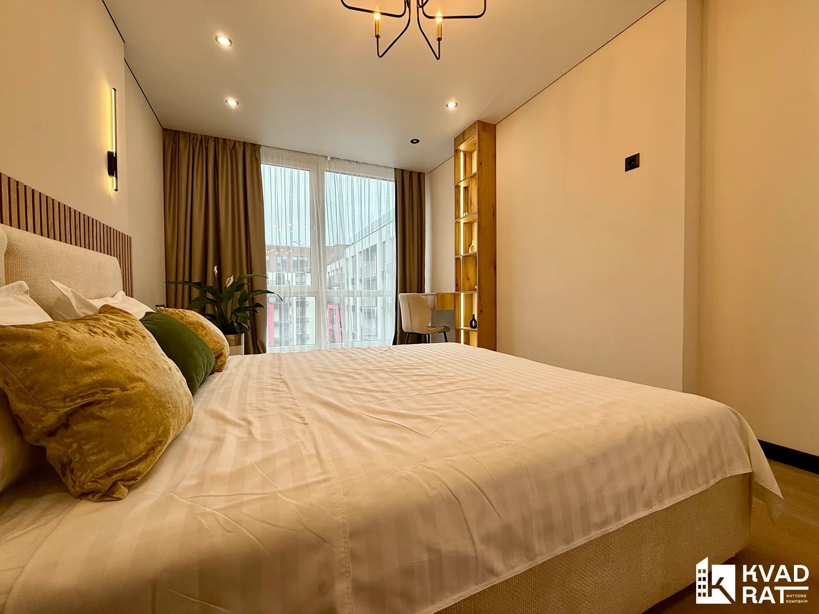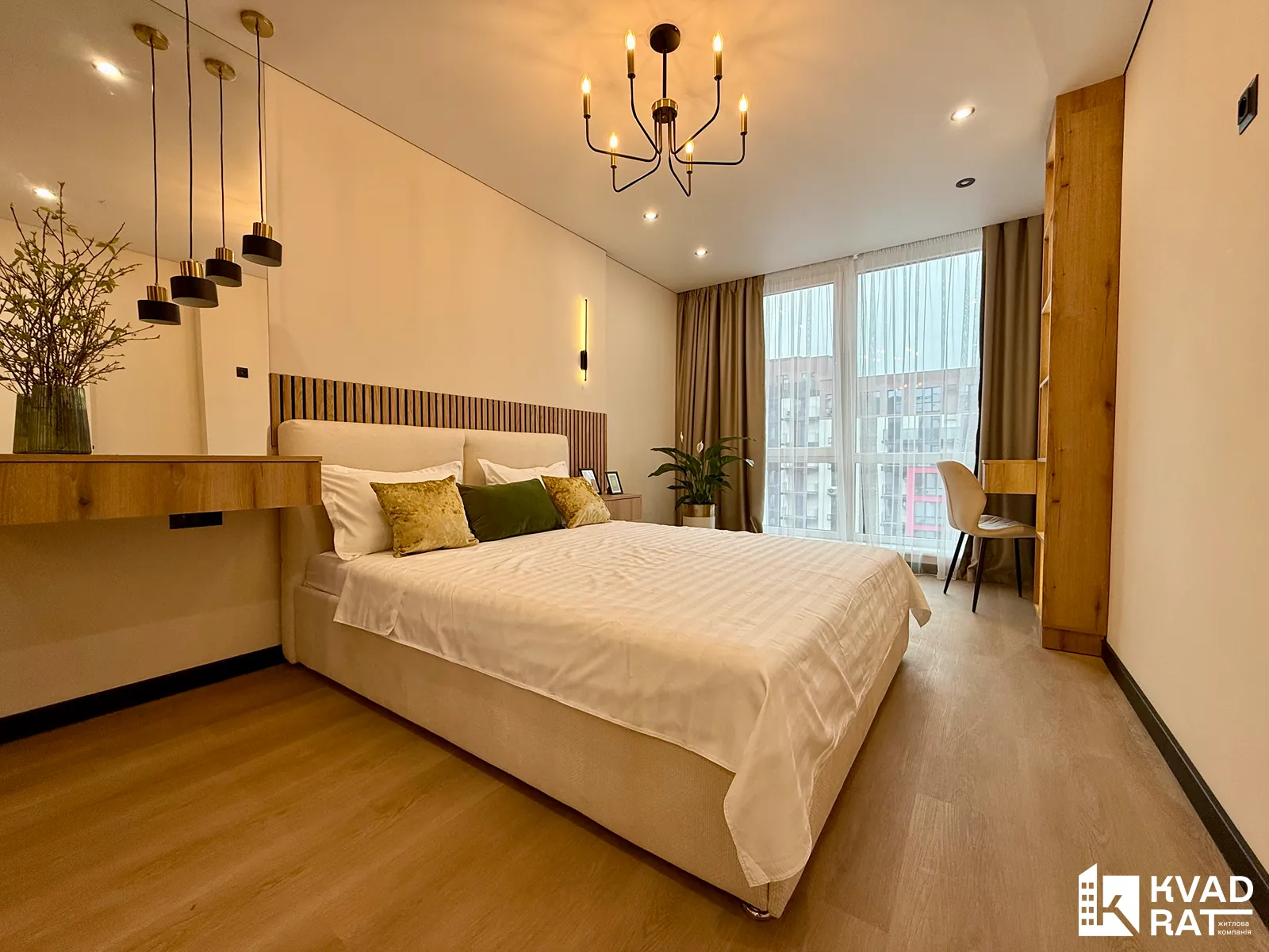 Спальня простора та затишна: велике двоспальне ліжко, вбудована шафа, бюті-столик та окреме робоче місце.