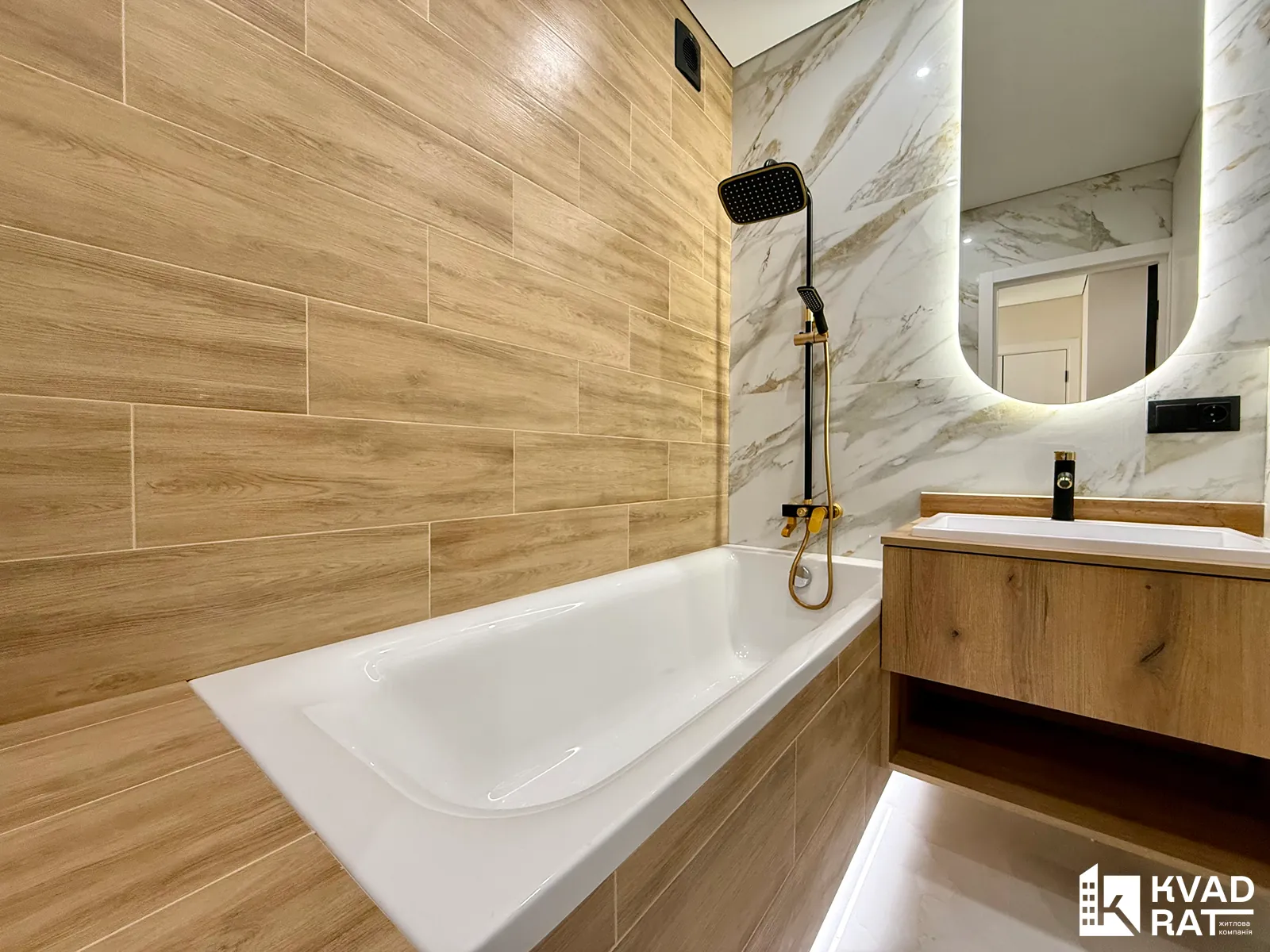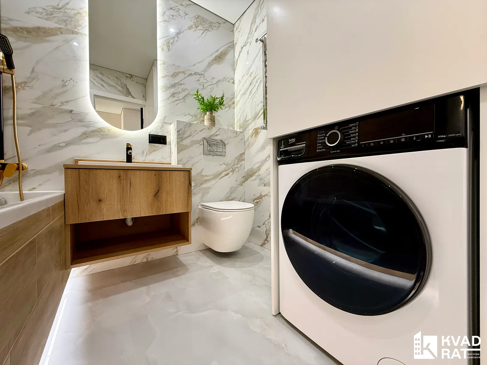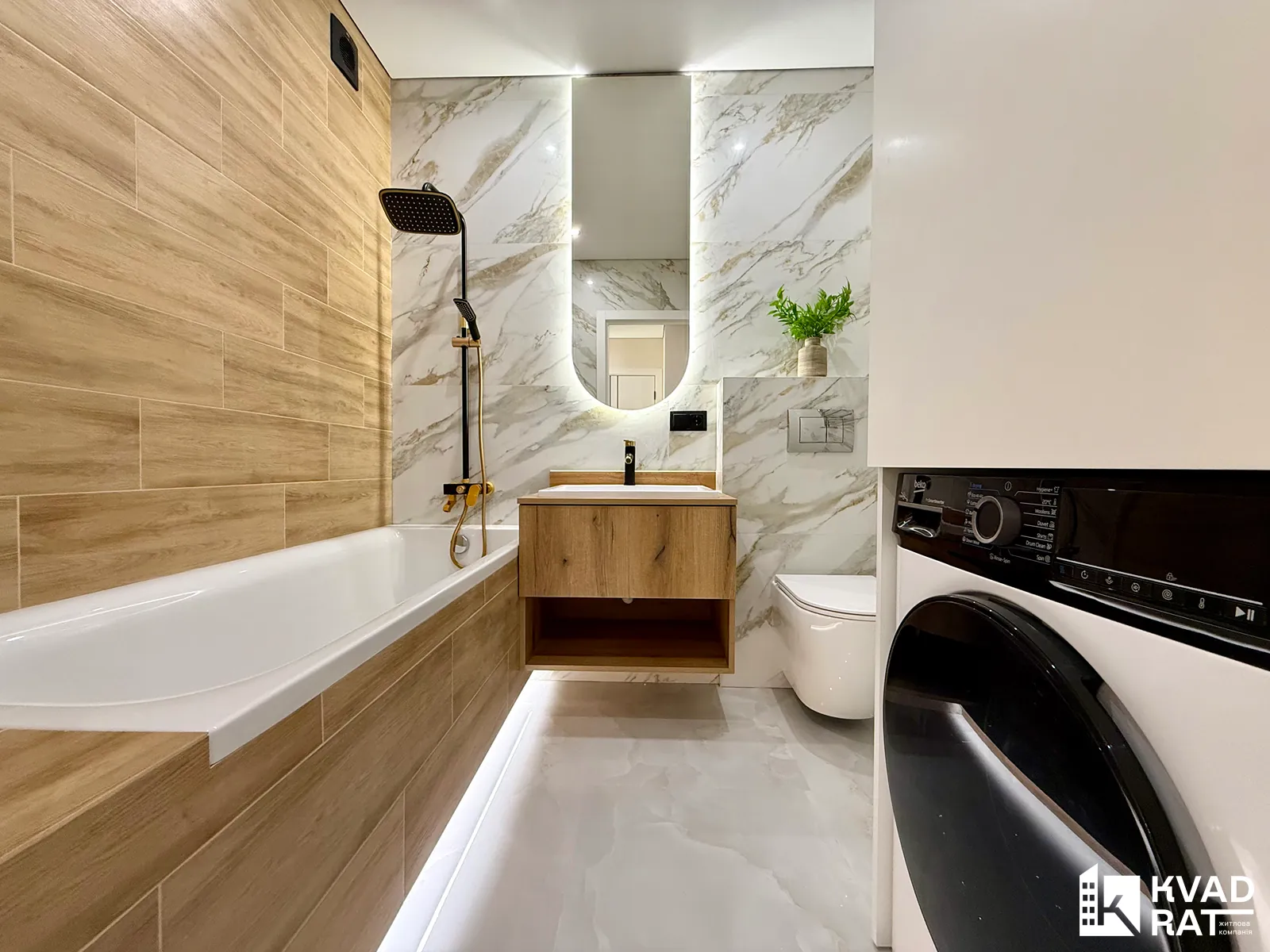 Санвузол укомплектований ванною з тропічним душем, умивальником із дзеркалом, інсталяцією, пральною машиною та бойлером.