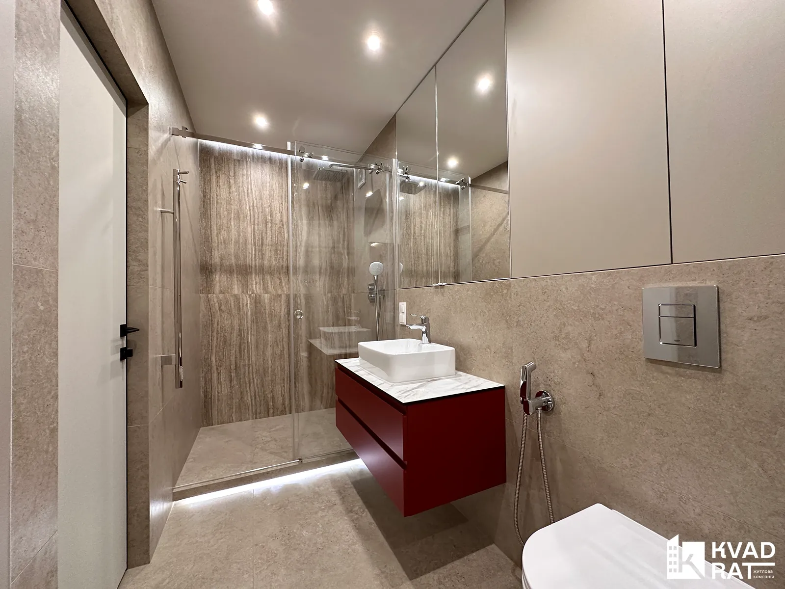 Інтерєр виконано у стриманій сучасній палітрі з використанням якісних матеріалів кварц-вініл, керамічна плитка, фарбовані стіни, продумане LED-освітлення.