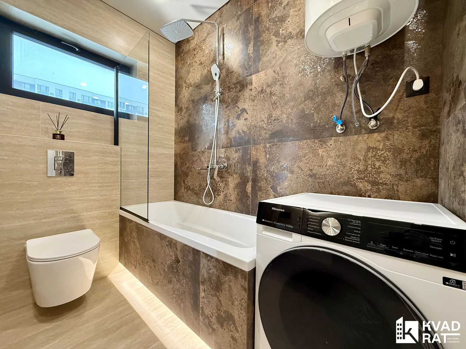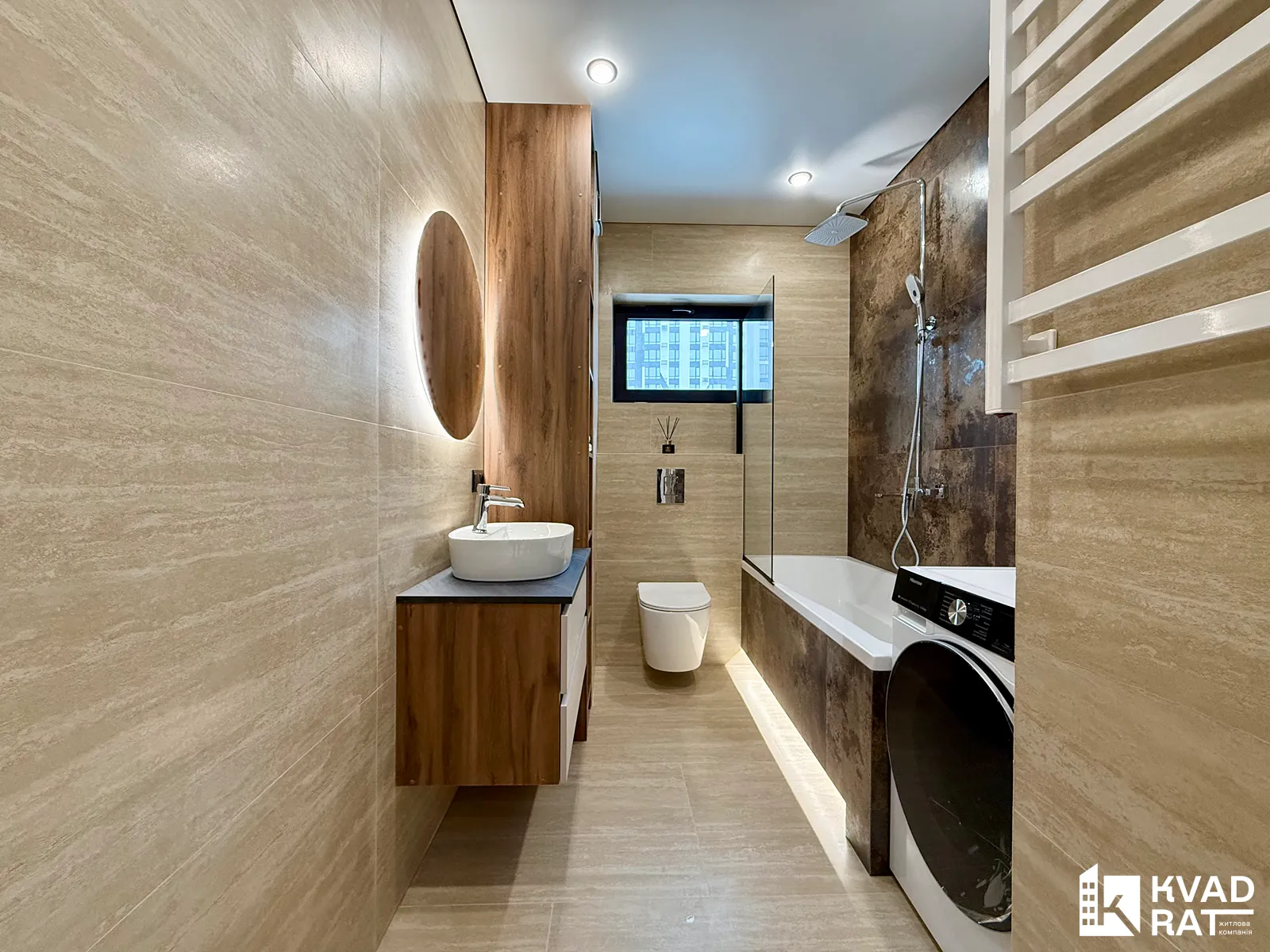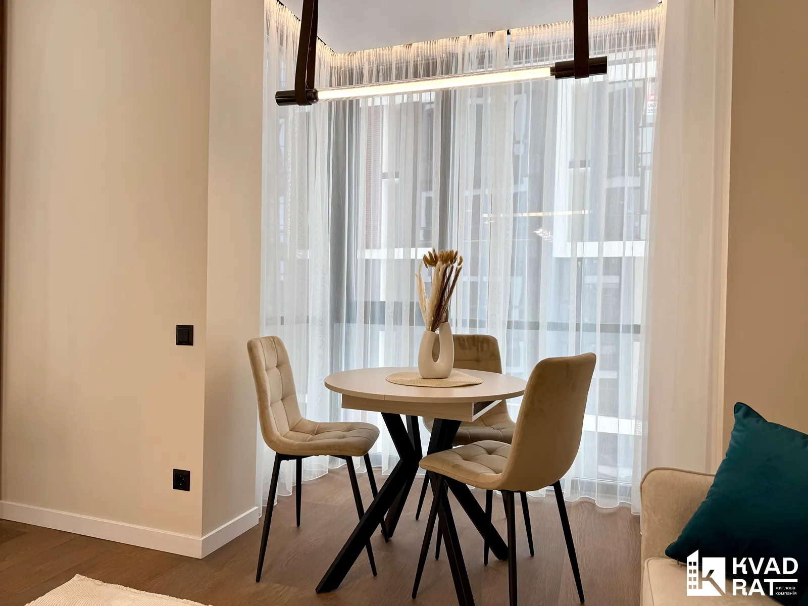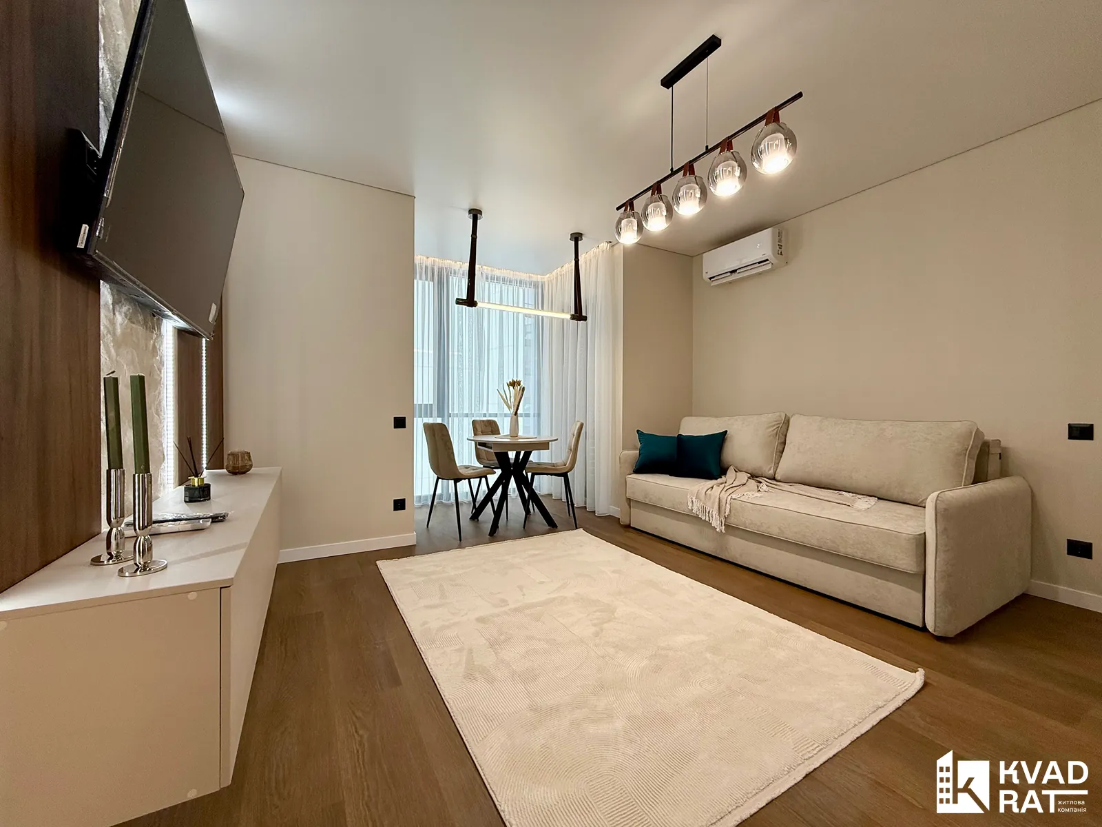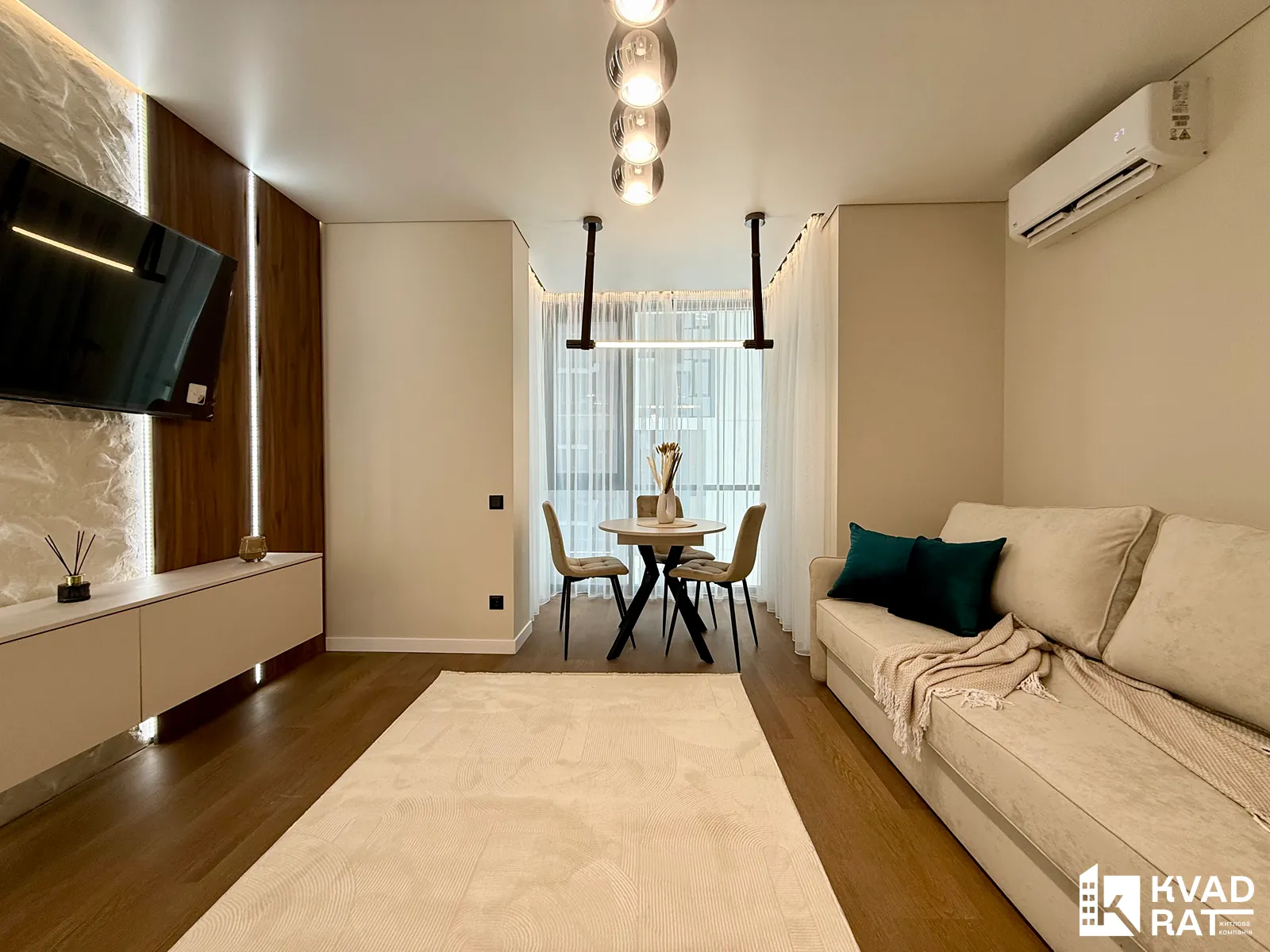 Квартира має дуже функціональне планування: простора кухня-студія, окрема спальня з виходом на власний відкритий балкон з видом у затишний внутрішній двір комплексу. Вмісткий санвузол обладнаний ванною з тропічним душем та має вікно, що додає природного світла й вентиляції.