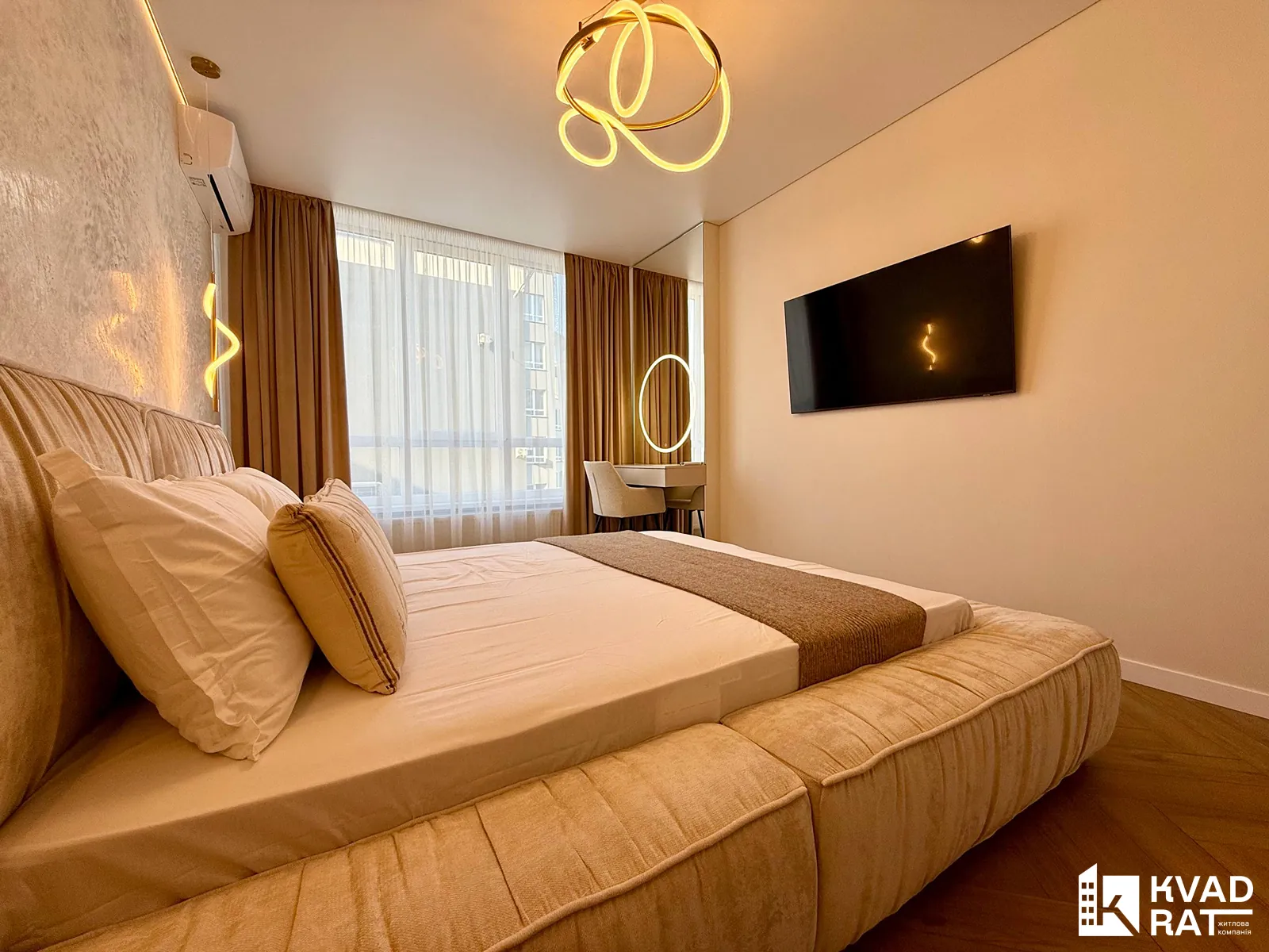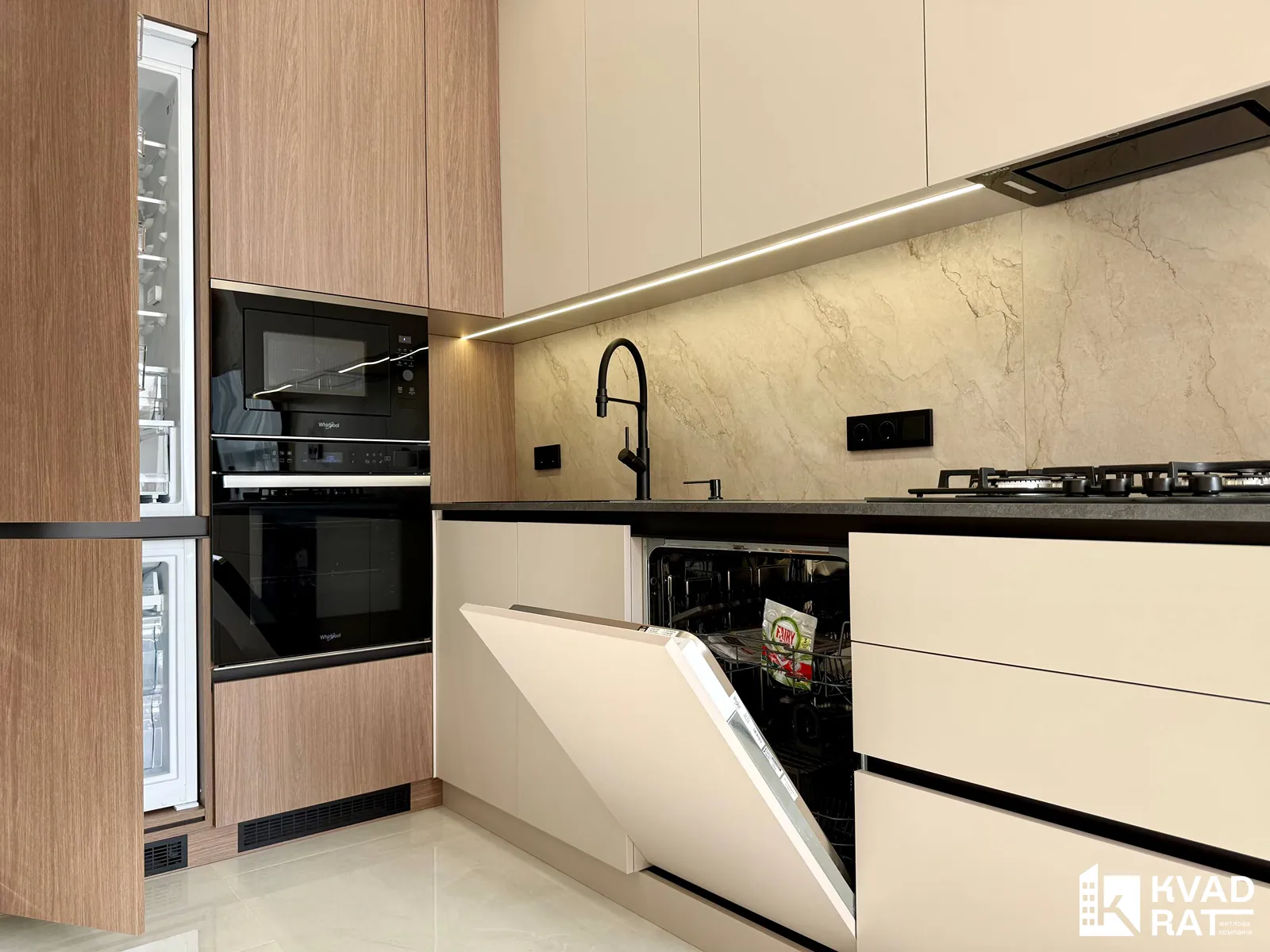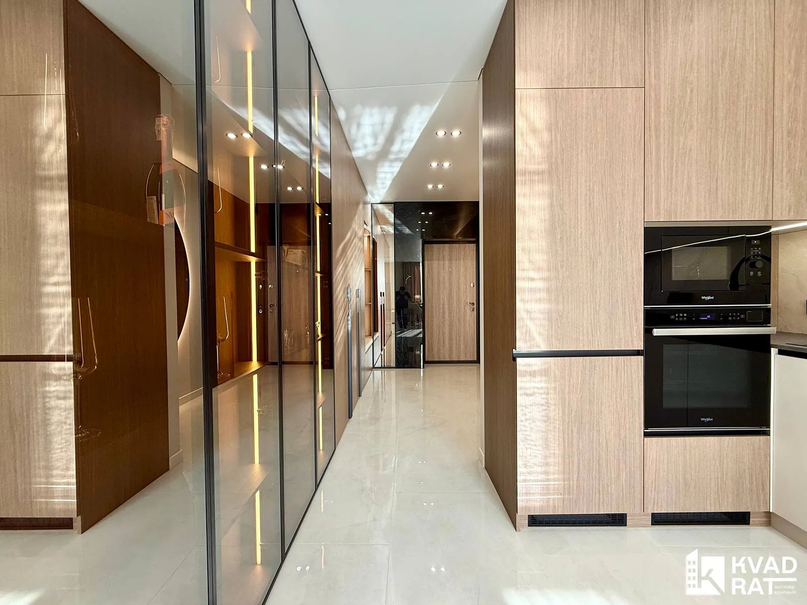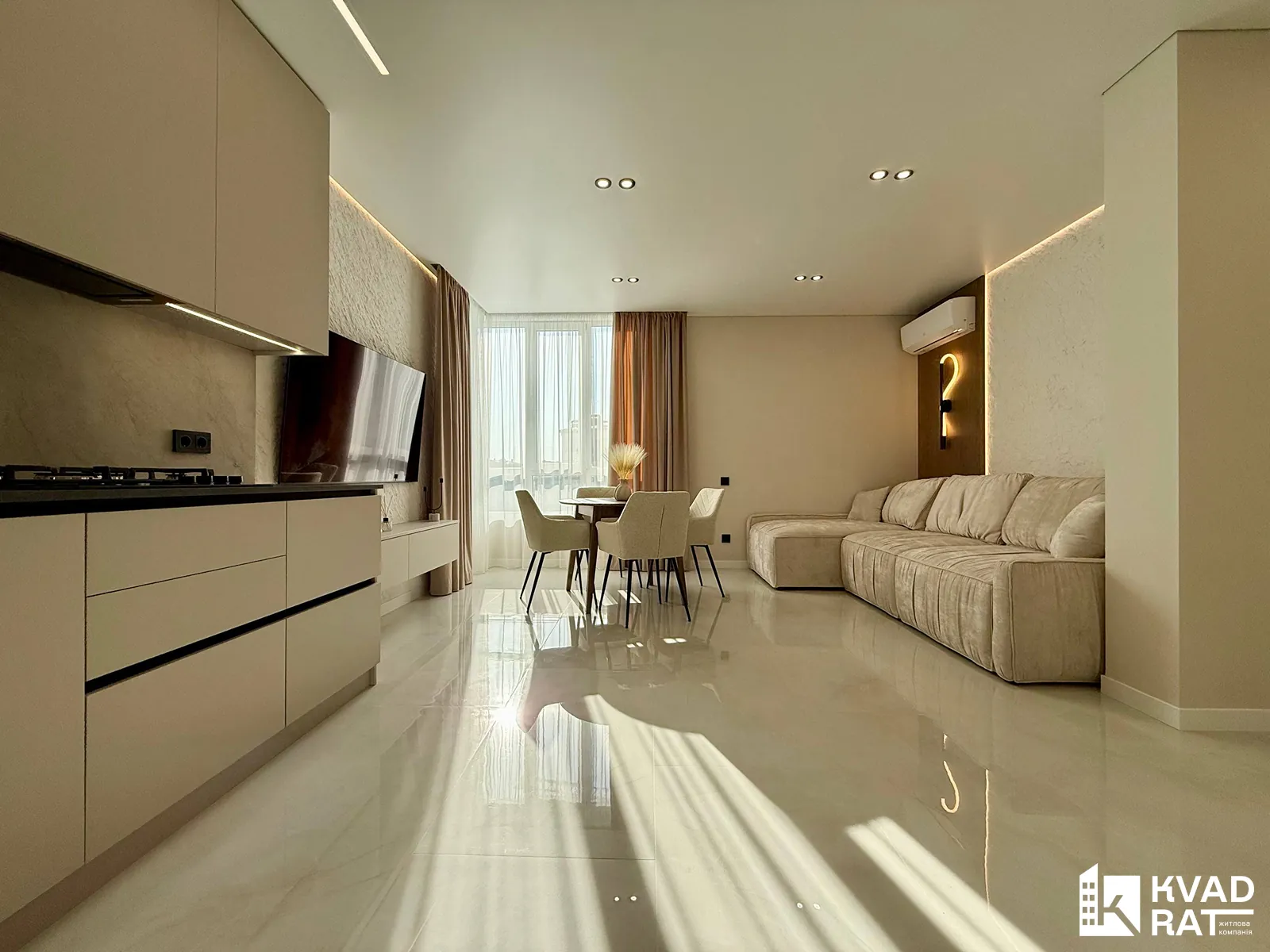 У квартирі виконаний якісний дорогий ремонт із використанням сучасних та практичних матеріалів. Кухня укомплектована меблями з якісною фурнітурою Blum та вмонтованою технікою Whirlpool. Для комфортного мікроклімату встановлені кондиціонери CooperHunter.