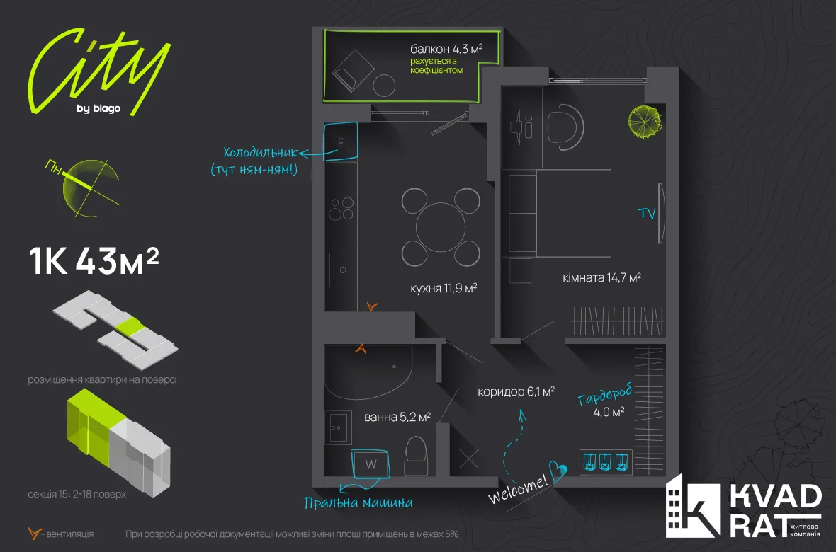 Видова 1-к квартира в самому центрі міста ЖК City by Blago