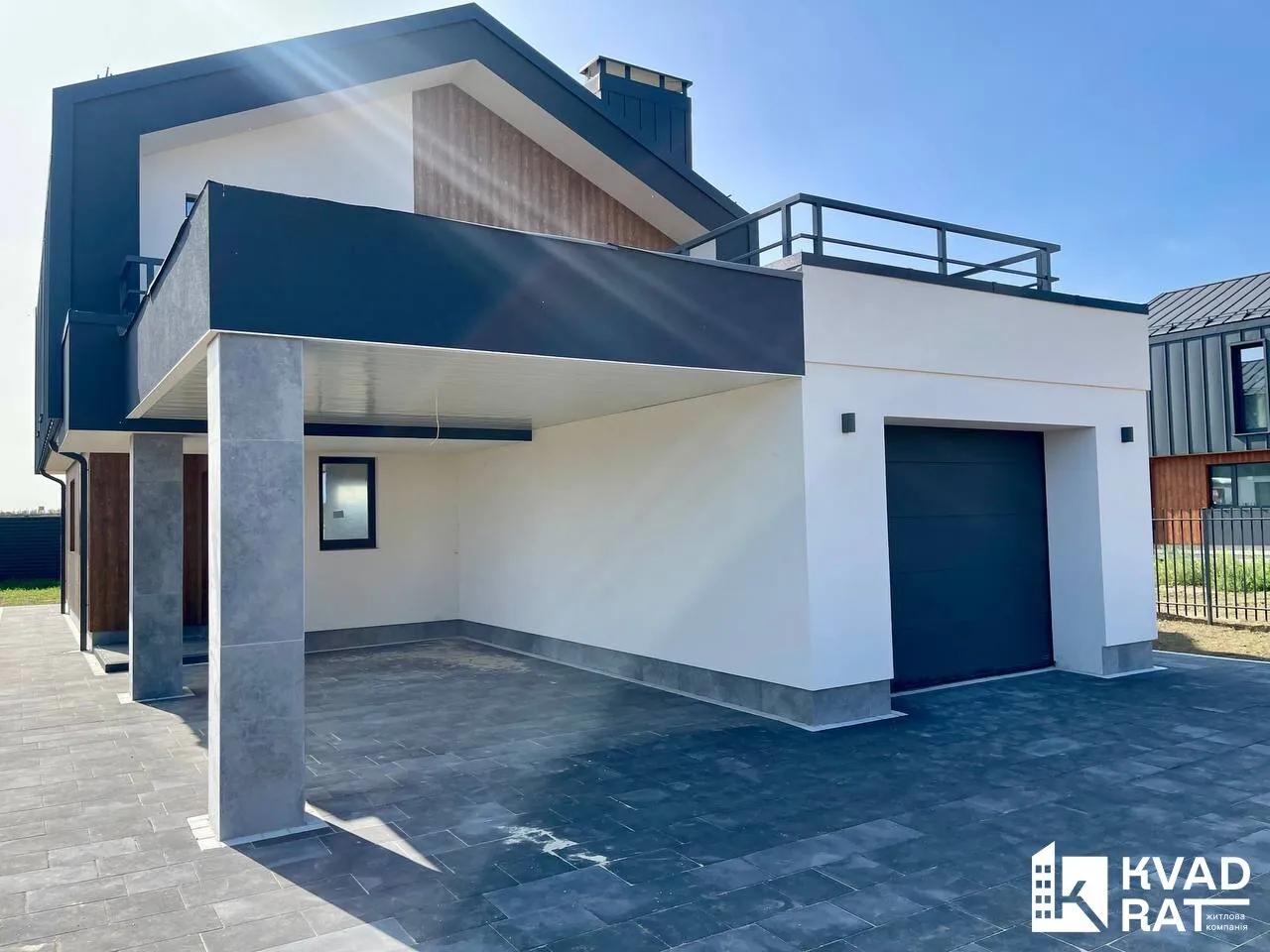Сучасний індивідуальний будинок з ергономічним плануванням, просторими терасами та експлуатованими покрівлями над гаражами.