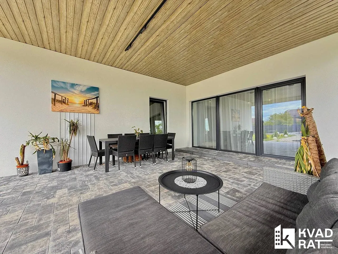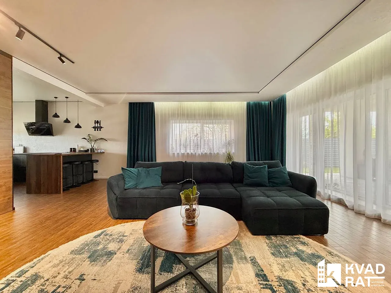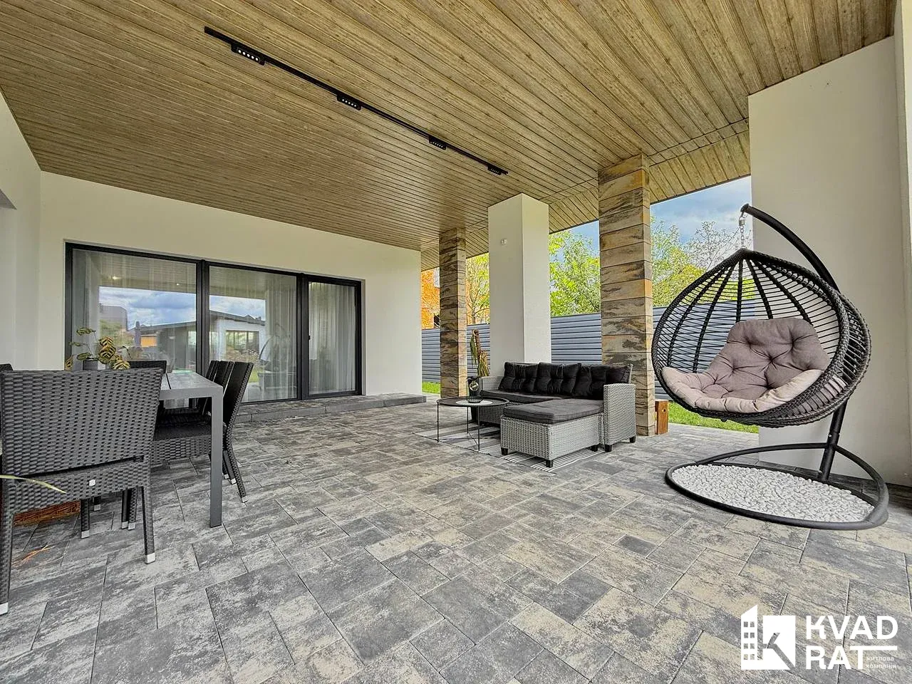простора кухня-вітальня 61м2 з виходом на задню терасу, 4 спальні кімнати, 3 санвузли, гардеробна, комірка при кухні, паливна, пральня, просторий гараж на 2 автомобілі. Також є доступ до горища.