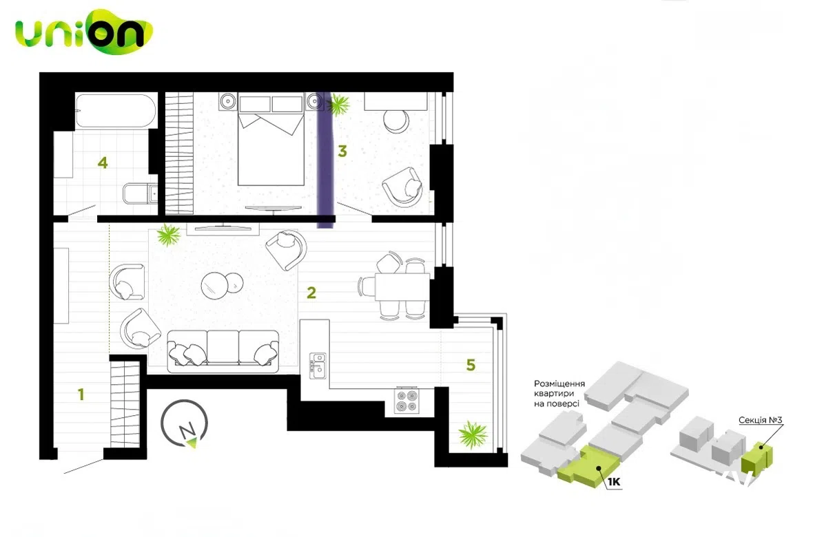 Велика кухня-студія з продуманою робочою зоною та зоною відпочинку, окрема спальня, дитяча кімната та просторий санвузол.