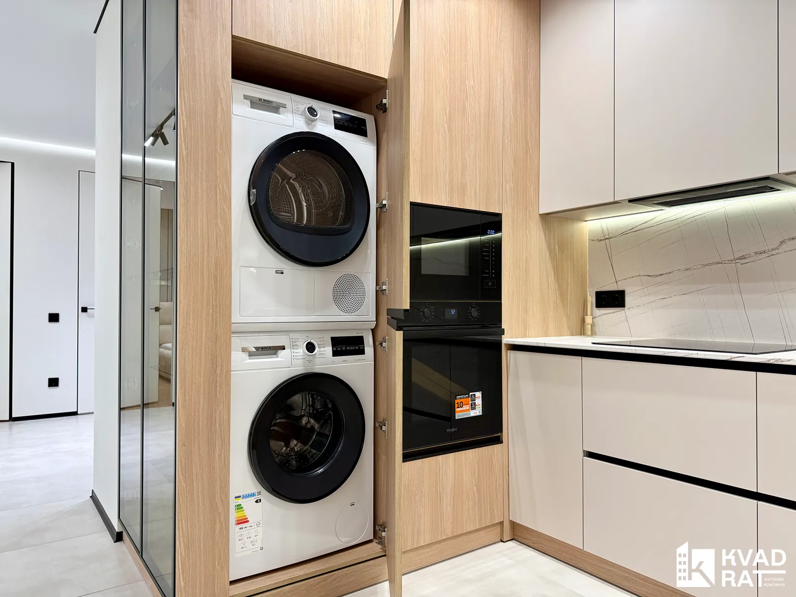 Квартира повністю укомплектована вмонтованою побутовою технікою духовка мікрохвильова піч індукційна варильна поверхня вбудована посудомийна машина холодильник а також пральна та сушильна машини. Спальні кімнати просторі та світлі з гарним видом у бік міста