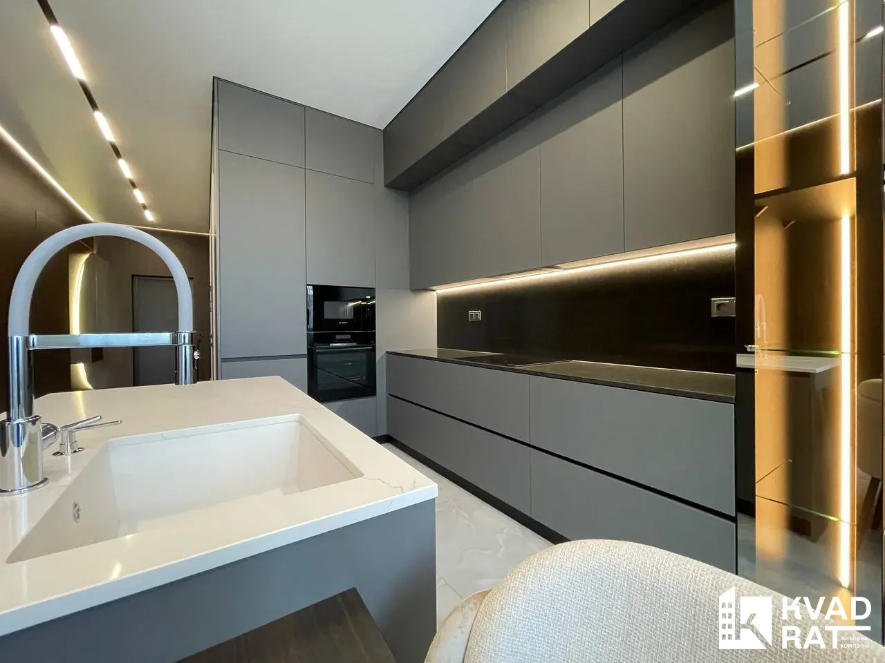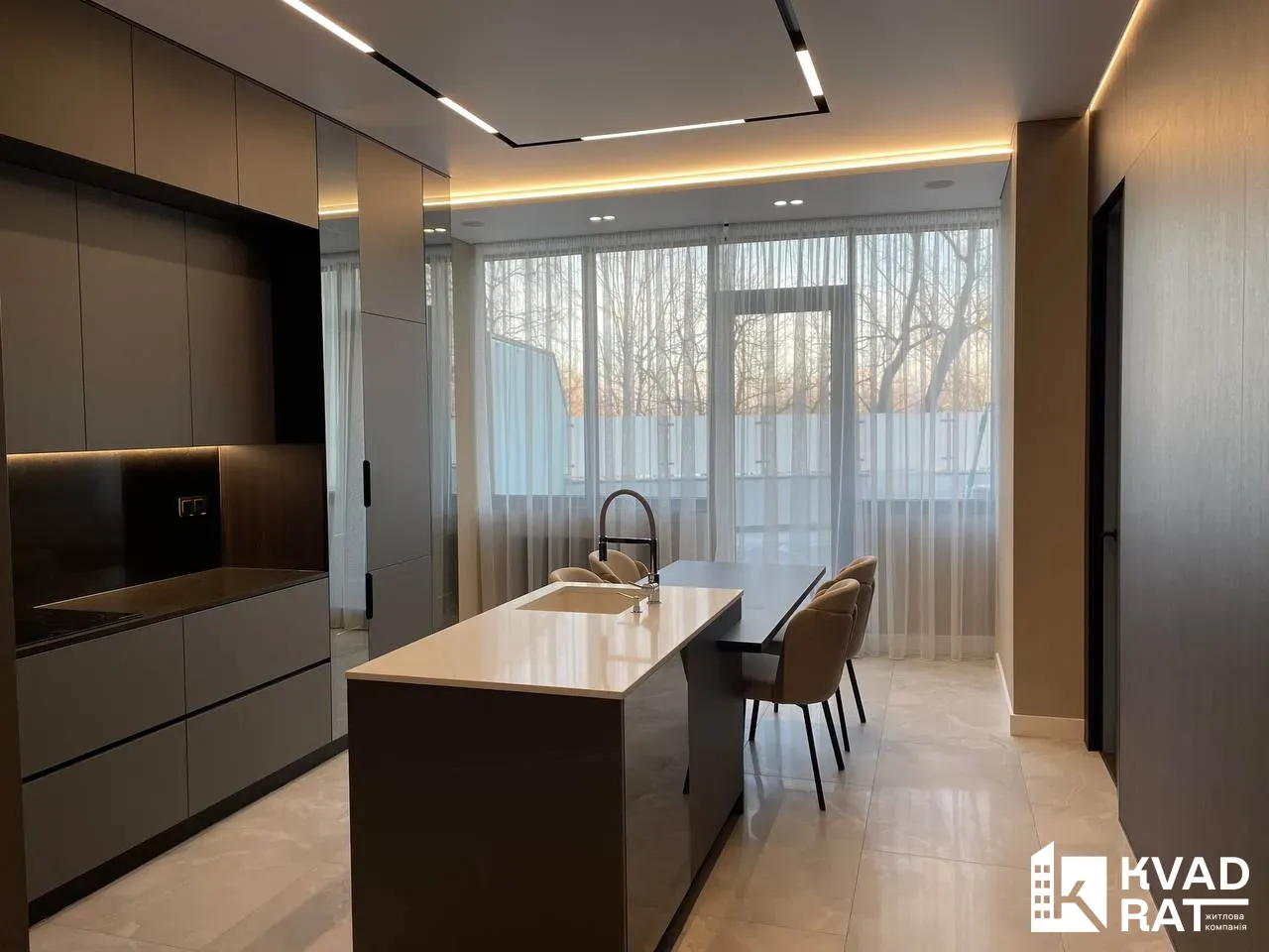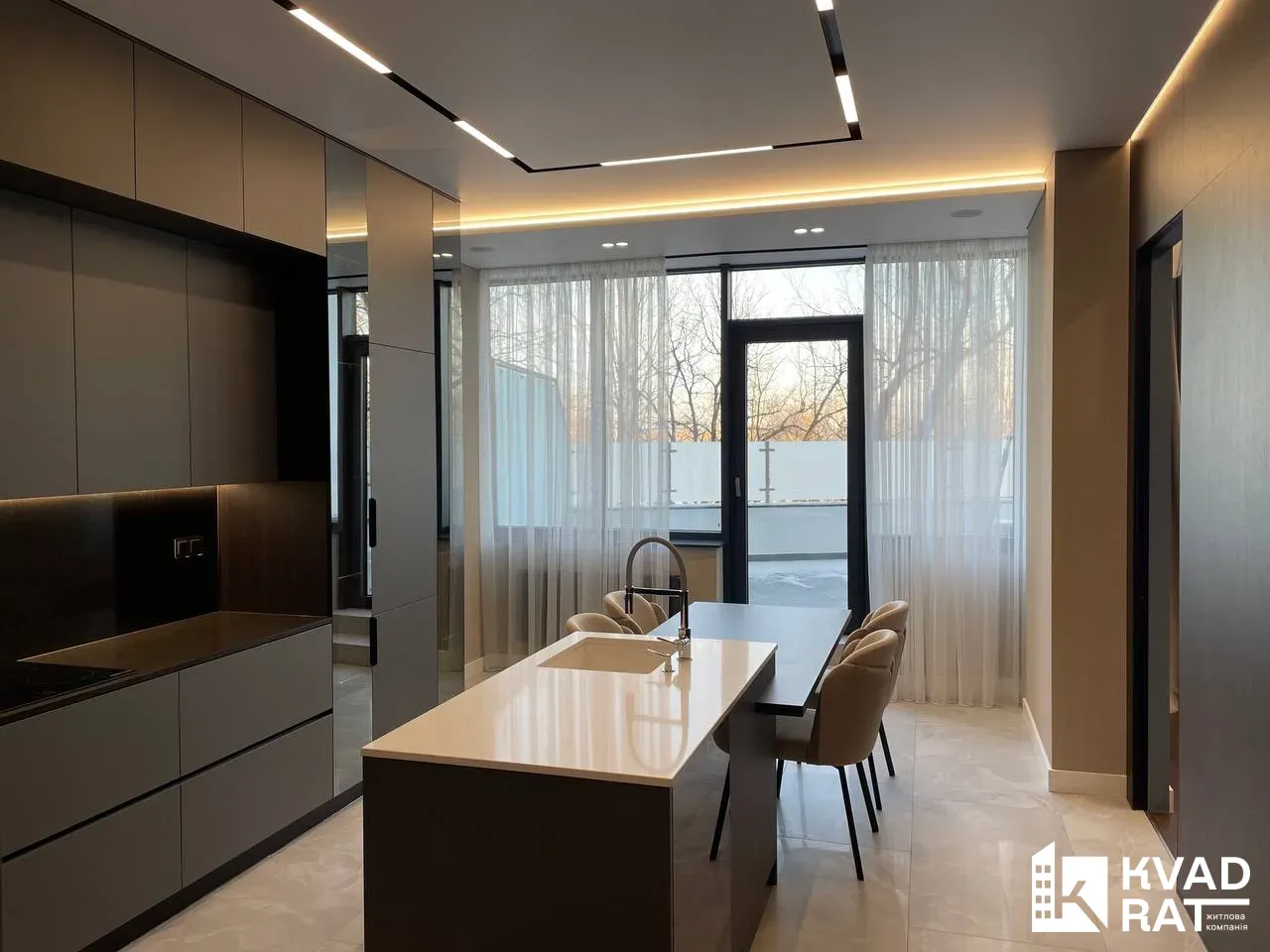 Встановлено якісну кухню зі стільницею з граніту, вся техніка скритого монтажу. Додатково змонтований «острів», який плавно переходить в обідній стіл.