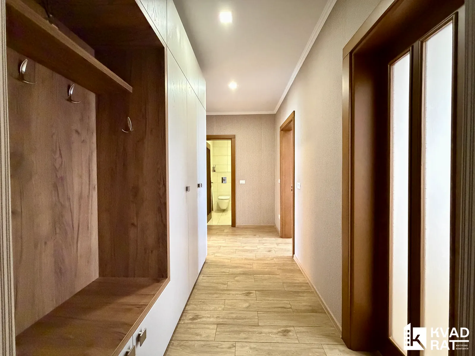 -Вхідна зона з великою розпашною шафою та місцем, щоб зручно присісти