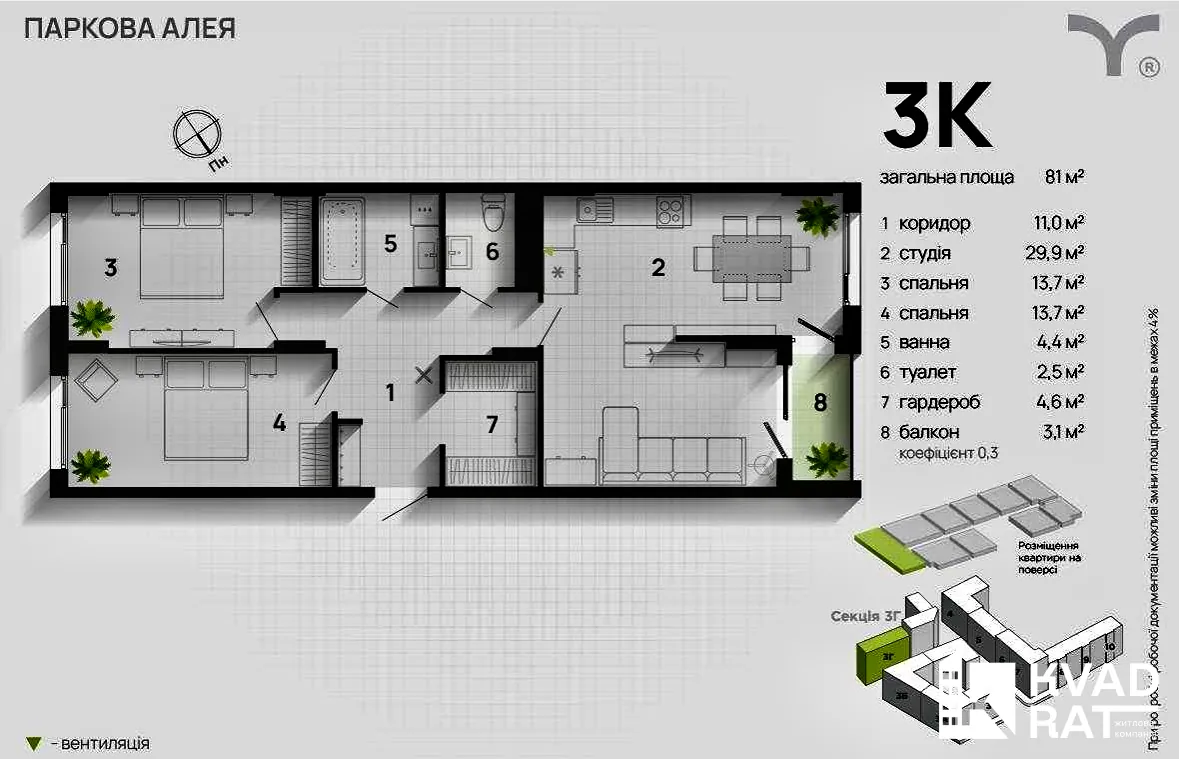 Простора 3 кімнатна квартира ЖК ПАРКОВА АЛЕЯ на 2 житловому поверсі, функціональне планування з кухнею студією 30м2 .