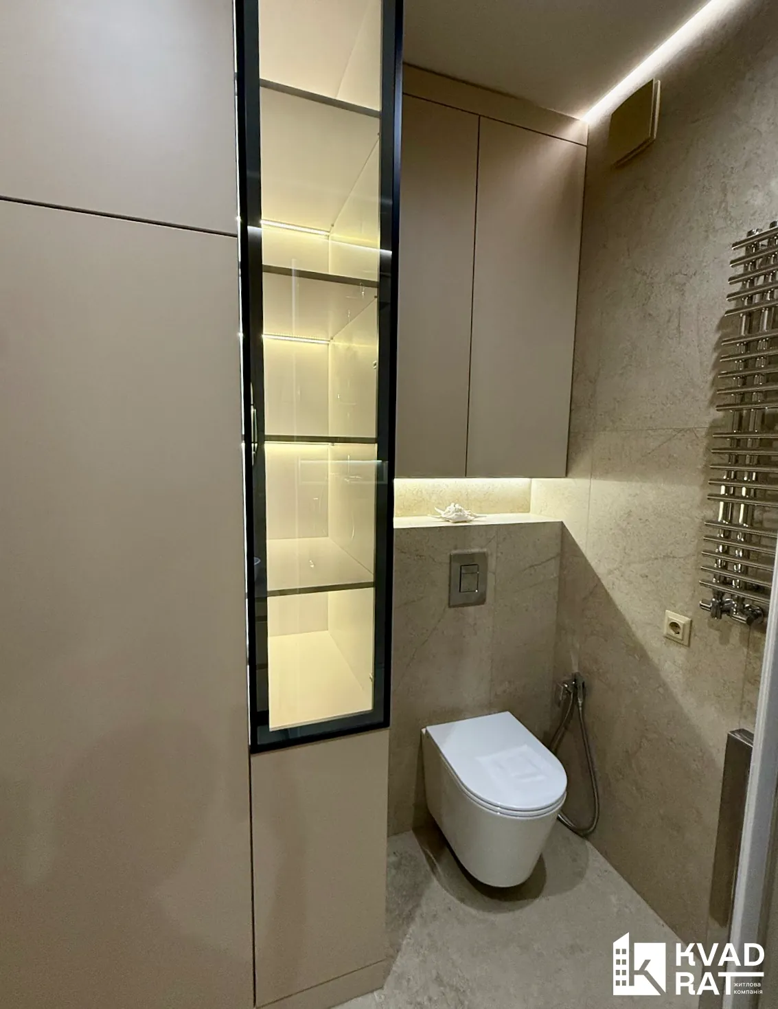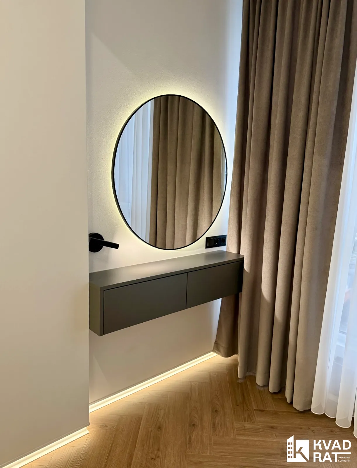 Ремонт виконано з використанням якісних матеріалів та фурнітури від відомих виробників. Меблі виготовлені з МДФ з матовим фарбованим покриттям. У квартирі встановлено індивідуальне опалення, теплу підлогу, дизайнерські радіатори та вбудовані конвектори.