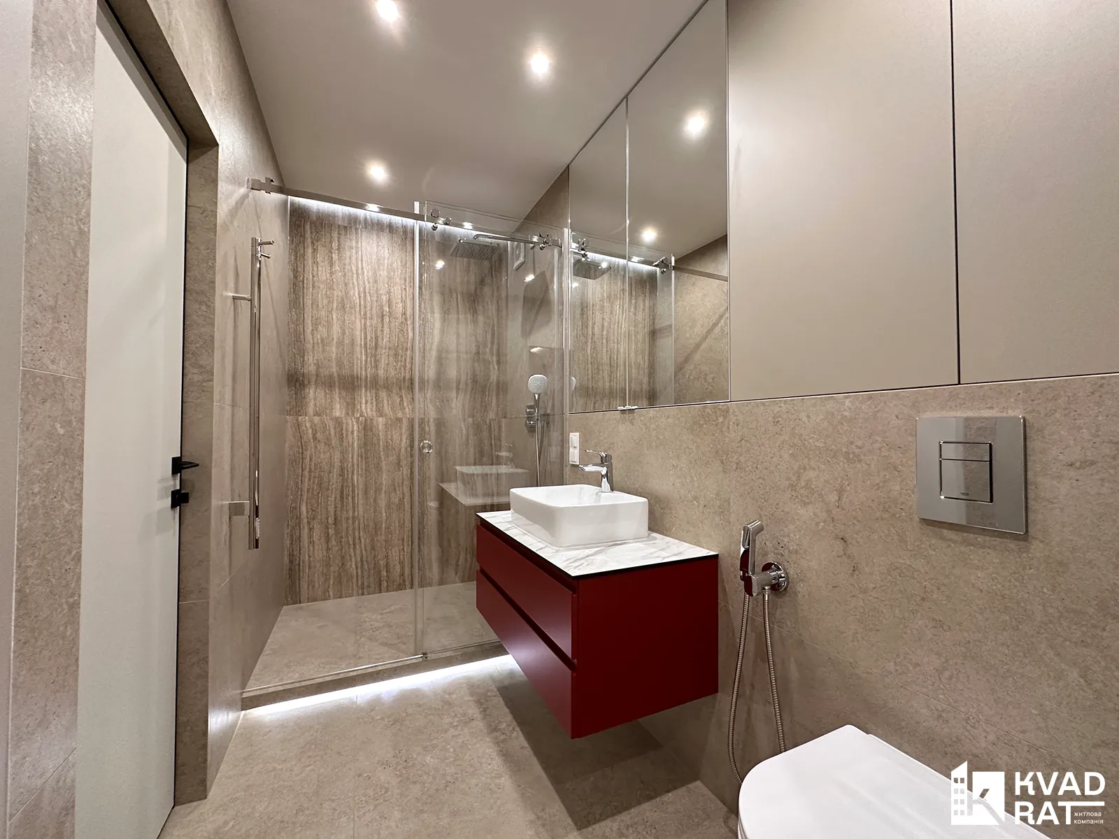 Інтерєр виконано у стриманій сучасній палітрі з використанням якісних матеріалів кварц-вініл, керамічна плитка, фарбовані стіни, продумане LED-освітлення.